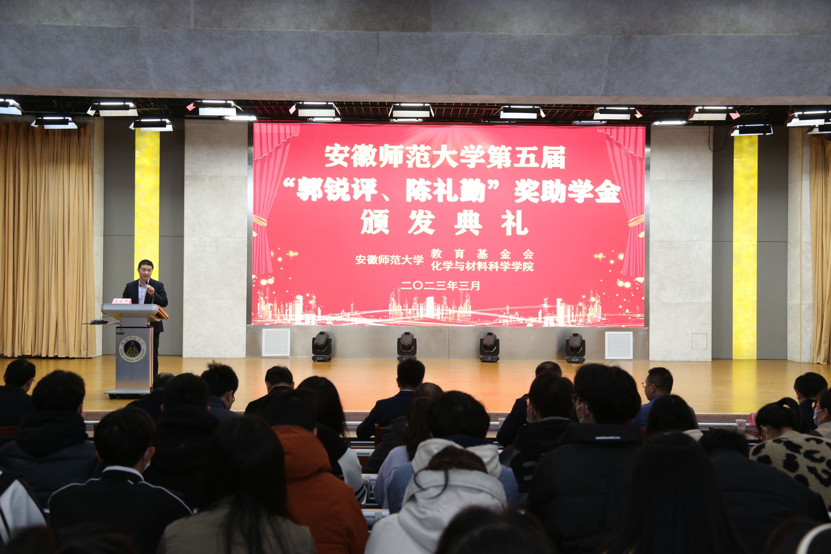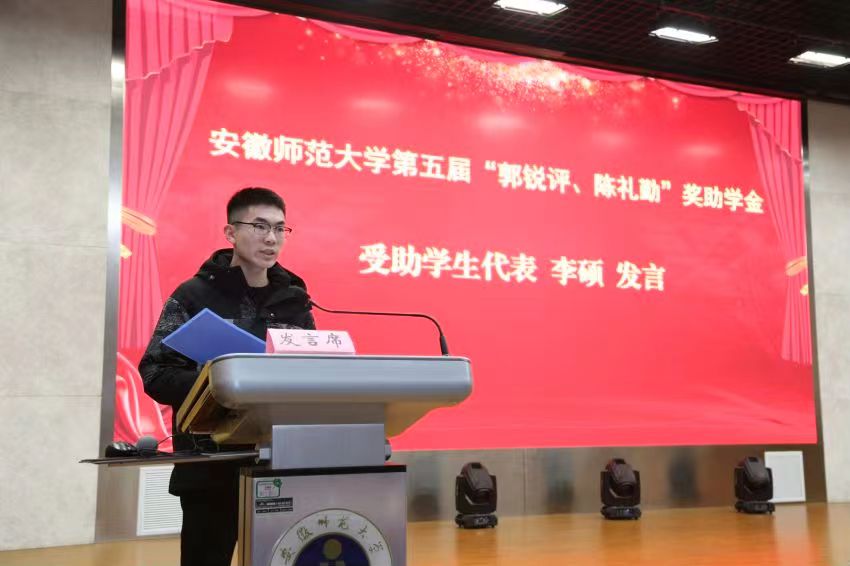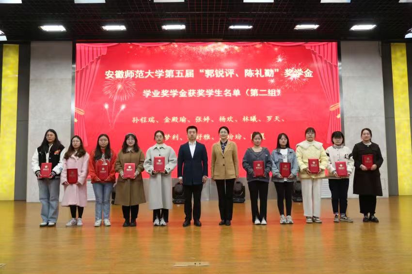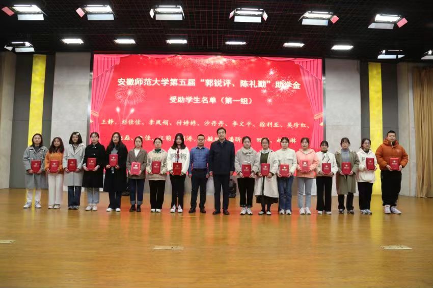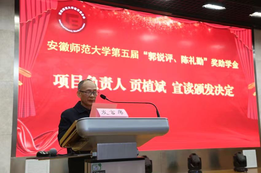 活动在庄严的国歌中拉开序幕。项目负责人贡植斌首先宣读了《关于颁发安徽师范大学第五届“郭锐评、陈礼勤”奖助学金的决定》。嘉宾们分5个批次共15组向209名获奖、受助学生颁发奖助学金获奖证书。