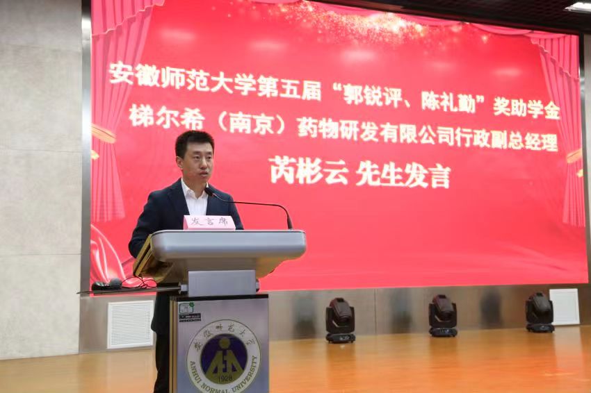 梯尔希(南京)药物研发有限公司行政副总经理芮彬云先生代为转达了郭锐评女士、陈礼勤博士对母校的思念之情,并向获奖、助学金学生表示祝贺并希望同学们能更加努力学习,回报学校、奉献社会,早日实现梦想、成为栋梁。同时希望更多师大学生能够加入梯尔希公司。