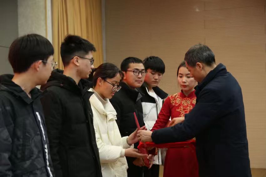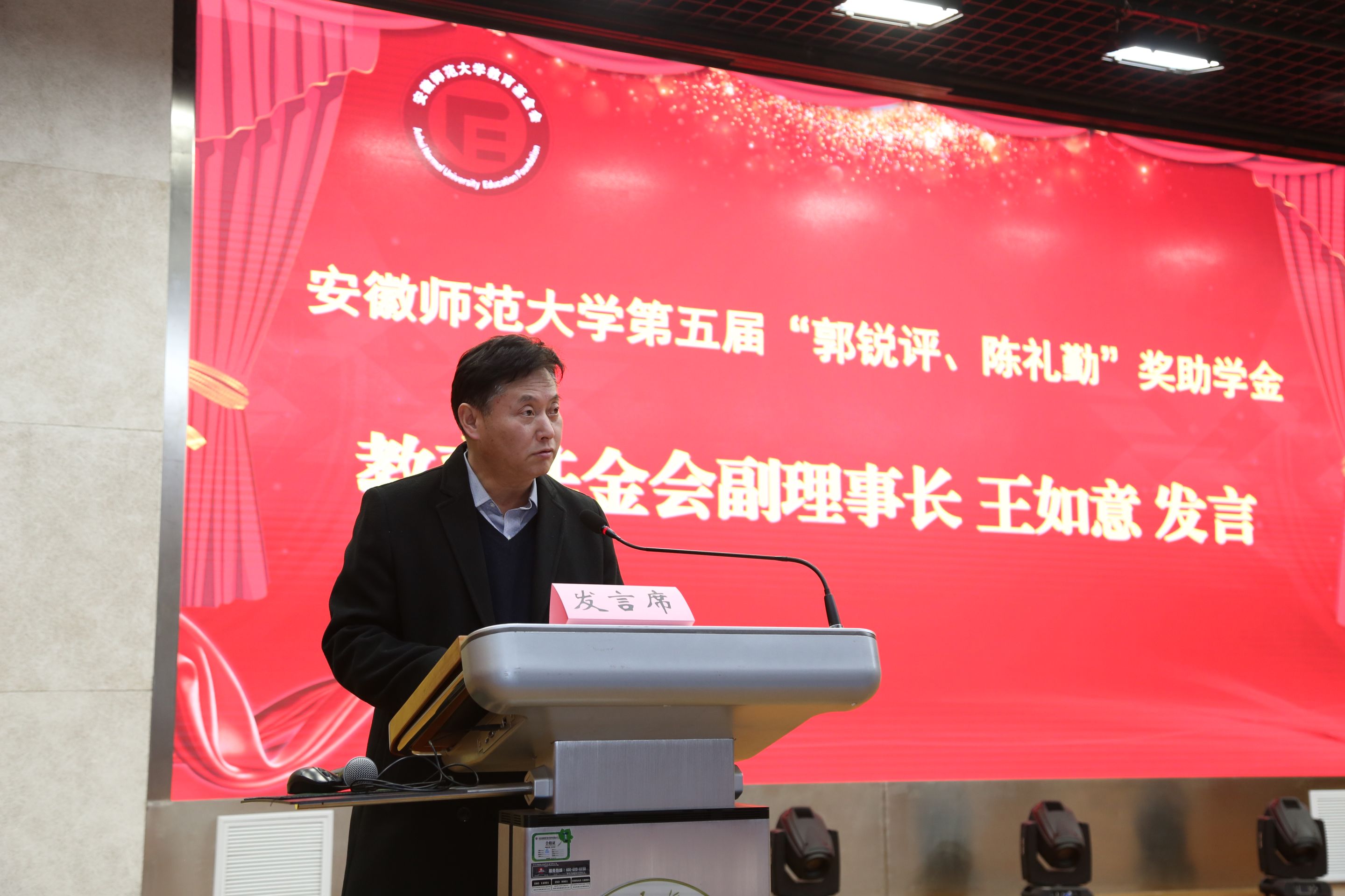 教育基金会副理事长王如意先生代表学校教育基金会向梯尔希(南京)药物研发有限公司芮彬云先生一行表示热烈欢迎并向209名获奖、受助的同学表示热烈的祝贺。他指出,“校友是母校靓丽的名片”,母校的建设与发展得到了校友们的广泛关注,得益于校友们的大力支持。作为杰出校友,郭锐评女士、陈礼勤先生始终怀着一颗回报母校的赤诚之心,一直关心和支持学校各项事业的建设和发展。多年来无数的善行义举无不体现了郭锐评女生、陈礼勤先生心系母校发展的深厚感情和期盼母校腾飞的真诚心愿。王如意对获奖学生们提出三点希望,希望同学们不负青春,做一位有志气的新时代青年。同学们要志存高远、胸怀天下,厚植家国情怀,树立为祖国和人民永久奋斗、赤诚奉献的远大理想,立志成为合格的社会主义事业建设者和接班人。希望同学们不负韶华,做一位有骨气的新时代青年。希望同学们树立梦想从学习开始、事业靠本领成就的观念,无论走到哪里,始终保持热爱学习、勤于奋斗的本色,要主动适应学校培养一流人才的目标和要求,积极为学校“两大振兴行动计划”增添力量,不负学校的殷切期望,不负老师的谆谆教诲。希望同学们不负时代,做一位有底气的新时代青年。青年强则国强,青年兴则国兴。同学们要对未来早作规划、设立目标,不懈努力,重视课内外实践训练,关注世界前沿和国家发展,做到融会贯通、厚积薄发,让青春在党和人民需要的地方绽放绚丽之花。在今后取得更大的成绩,不辜负郭锐平女士、陈礼勤博士的殷切期望。