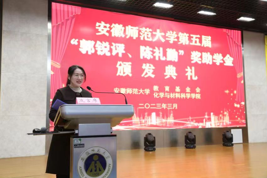 2019级化学(师范)专业戴玢玢和2020级应用化学专业李硕分别代表获奖、受助同学发言,两位同学对郭锐评女士、陈礼勤博士的无私资助表达了诚挚的敬意,并向学校、学院老师和同学们的关心表达了感谢。两位同学表示将怀揣感恩之心,将这份荣誉化为不竭的动力,以更加优异的成绩来回报郭锐评女士、陈礼勤博士及学校学院给予的关心和帮助,并努力将这份大爱精神传承下去,积极投身于社会建设,以梦为马,不负韶华。