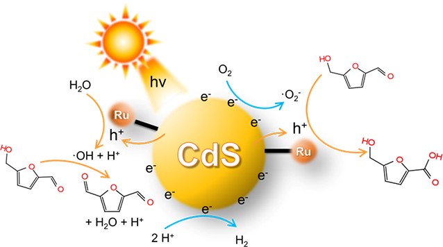 我校熊宇杰教授研究团队通过在 CdS 量子点上锚定 Ru 配合物,开发了一种高效的光催化剂。基于在不同的气氛下可控生成的两个氧自由基,实现了 HMF 向 DFF 或 HMFCA 的选择性氧化,并且具有高转化率(>81%)和选择性(>90%)。这种选择性光催化转换也可以在实验室外通过自然阳光正常驱动。该工作首次实现了通过太阳光驱动HMF选择氧化生产HMFCA。更重要的是,该光催化剂已被证明适用于其他具有羟基和醛基化合物的选择氧化。