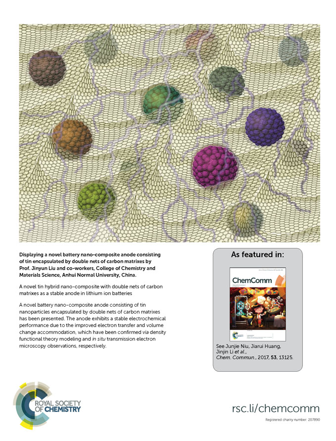 刘金云、黄家锐课题组针对上述瓶颈问题,开展深入研究,以金属Sn/石墨烯复合负极为例,创新性地设计了石墨烯/Sn/碳质材料双巢复合结构,既实现了高容量Sn金属的纳米化,又为其提供充放电体积变化的缓冲空间,促进其表面形成稳定的固态电解质界面膜,大大提高库伦效率(接近100%)和容量稳定性。原位透射电镜技术更是直接证实了充放电的结构变化,表明活性材料本身的大幅体积变化并不影响整体电极的结构完整性。正极方面,以研制Li3V2(PO4)3/石墨烯复合正极为例,发现复合材料在4.3-3.0 V及4.8-3.0 V两个电压范围内都展现出高能量密度和稳定性。0.5 C条件下在4.3-3.0 V电压范围内500次循环的电极能量密度依然保持370 Wh/kg以上;在低温?5 °C条件下,复合材料也具备高容量保持率。此外,NiMn2O4与NiCo2O4/石墨烯复合材料也表现出高的容量与稳定性,进一步验证了普适性合成方法的可行性和三维复合结构设计的适用性。相关研究结果发表在Chemical Communiction, 2017, 53, 13125-13128 (入选背封面论文); Journal of Power Sources, 2018, 378, 677-684; Journal of Alloys and Compounds, 2018, 739, 837-847; 2018, doi: 10.1016/j.jallcom.2018.01.097。