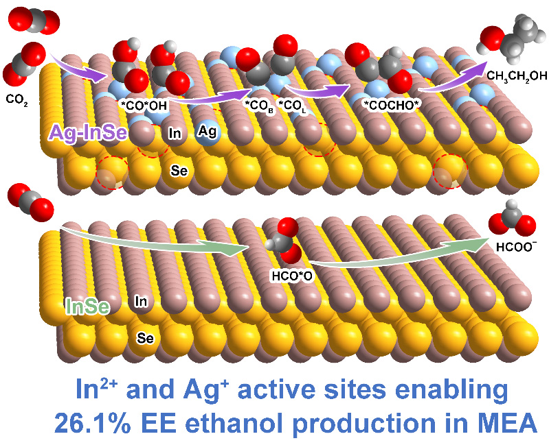 吴正翠教授、盛天副教授合作在电催化CO2转化研究领域取得重要进展。该成果以“Ag+-Doped InSe Nanosheets for Membrane Electrode Assembly Electrolyzer toward Large-Current Electroreduction of CO2 to Ethanol”为题发表在国际化学类顶刊Angewandte Chemie International Edition上(原文链接://doi.org/10.1002/anie.202313646)。