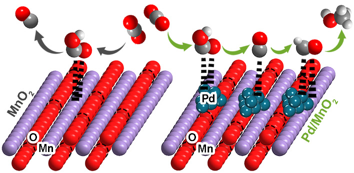 通过电催化的方式将二氧化碳转化为单一液体产物甲醇,是一种具有应用前景的技术途径。然而,如何在大电流密度下实现高选择性的转化,是该领域的巨大挑战。零间隙膜电池电解槽作为一种极具发展前景的装置,可以大大缩短电极间距离,消除阴极电解液的用量,实现大电流密度和低能耗下的二氧化碳转化应用。到目前为止,极度缺乏适用于膜电池电解槽的催化剂,并且获得的产物通常含有甲醇以外的多种液体产物,增加了下游分离的成本。该研究团队设计了钯纳米颗粒负载的二氧化锰纳米片复合催化剂,实现了膜电池电解槽中高选择性地将二氧化碳转化为单一液体产物甲醇。该催化剂在膜电池电解槽中,3.2 V电池电压下甲醇法拉第效率为77.6±1.3%,相应的偏电流密度为250.8±4.3 mA cm-2,全电池能量效率为29.1±1.2%。这项工作为膜电池电解槽中控制反应中间体,实现高选择性和高活性二氧化碳转化为甲醇开辟了一条新途径。