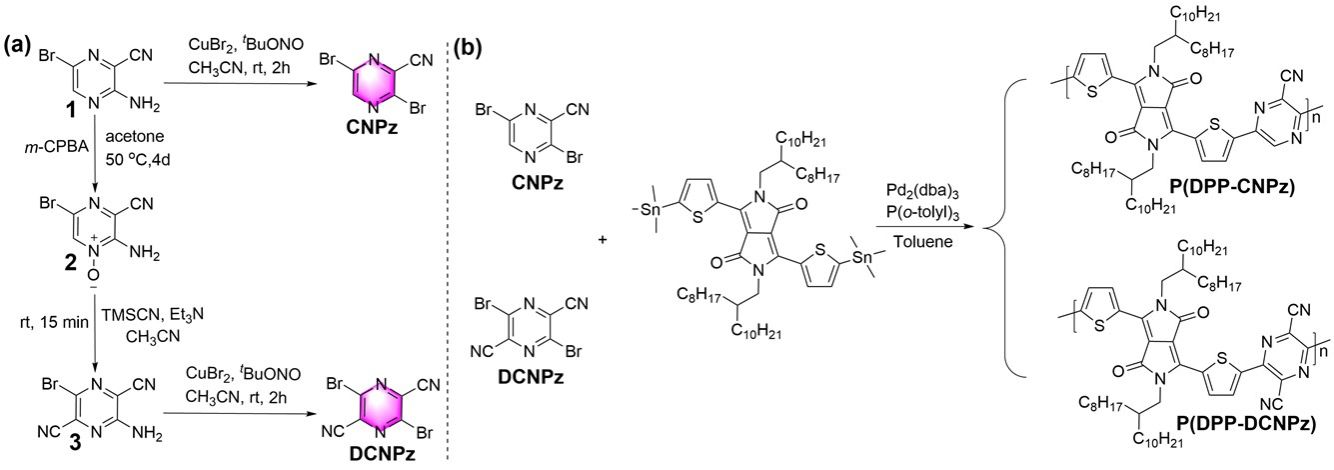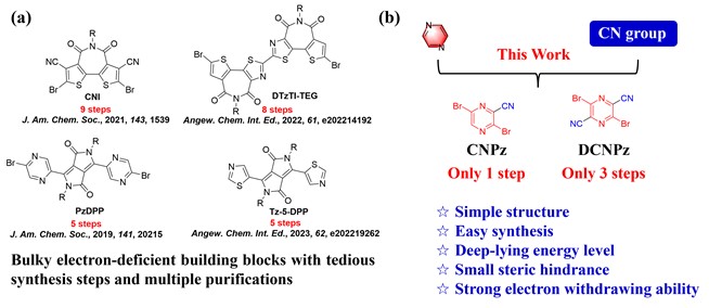 近日,我校史永强课题组采取以吡嗪环为主体,引入氰基取代基的策略,设计并合成出两个结构简单的缺电子构建单元CNPz和DCNPz。并在其基础上合成了两种受体-受体型聚合物P(DPP-CNPz)和P(DPP-DCNPz)。单体CNPz和DCNPz缺电子单元的合成只需要由廉价原料进行一步反应和三步反应得到,可以为下一步热电材料实际应用提供借鉴意义。