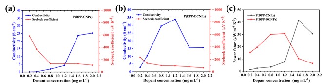 吡嗪和氰基强吸电子单元的引入,实现了材料的n-型电子传输性能。氰基的引入没有破坏分子的共平面性,这些优点使聚合物材料器件性能也格外优越。在N-DMBI掺杂剂掺杂下,P(DPP-CNPz)和P(DPP-DCNPz)的最佳电导率和功率因子分别为25.3 S cm-1和41.4 μW m-1 K-2,以及33.9 S cm-1和30.4 μW m-1 K-2。