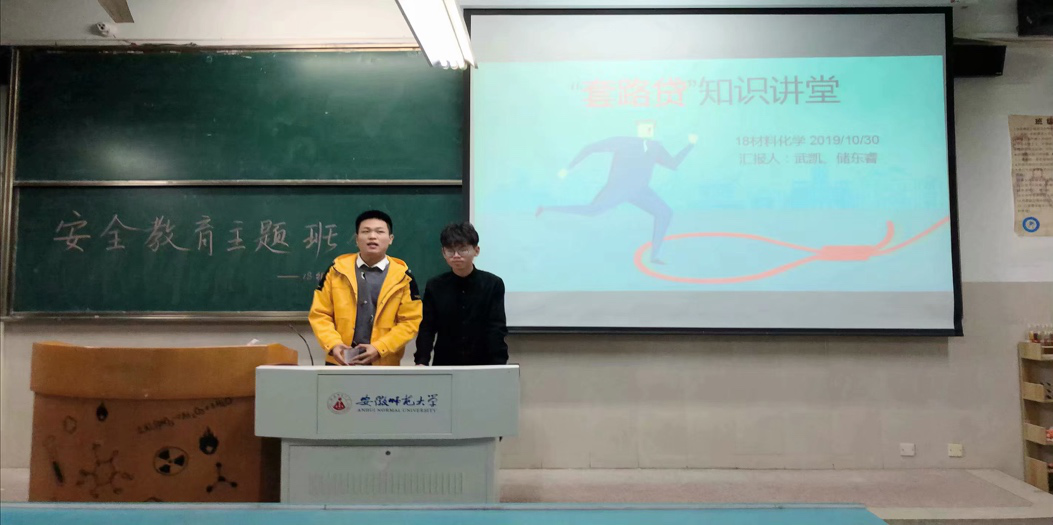 本网讯(2018级材料化学 陈凯凯)为增强大学生对“套路贷”的了解,提高防范意识,2019年10月31日晚上,2018级材料化学专业全体同学在安全委员储东睿和武凯同学的带领下,在2030103开展了“套路贷”知识讲堂。