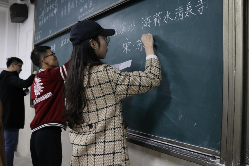比赛分为粉笔板书、硬笔书法和毛笔书写三项,要求选手在规定时间内完成文字的书写,各项比赛同时分区域进行。参赛者按照预先确定的顺序进行比赛,在他们的笔尖下,毛笔字一撇一捺苍劲有力,硬笔字一笔一划笔走龙蛇,粉笔板书一横一竖规范整齐。场上的选手们将诗意融入书法之中,在笔墨中沉淀升华人生。他们尽情展现书法功底,或潇洒飘逸,或力透纸背,或方圆兼备,短短的时间内便涌现一批批笔画流畅,横平竖直,结构匀称的佳作。