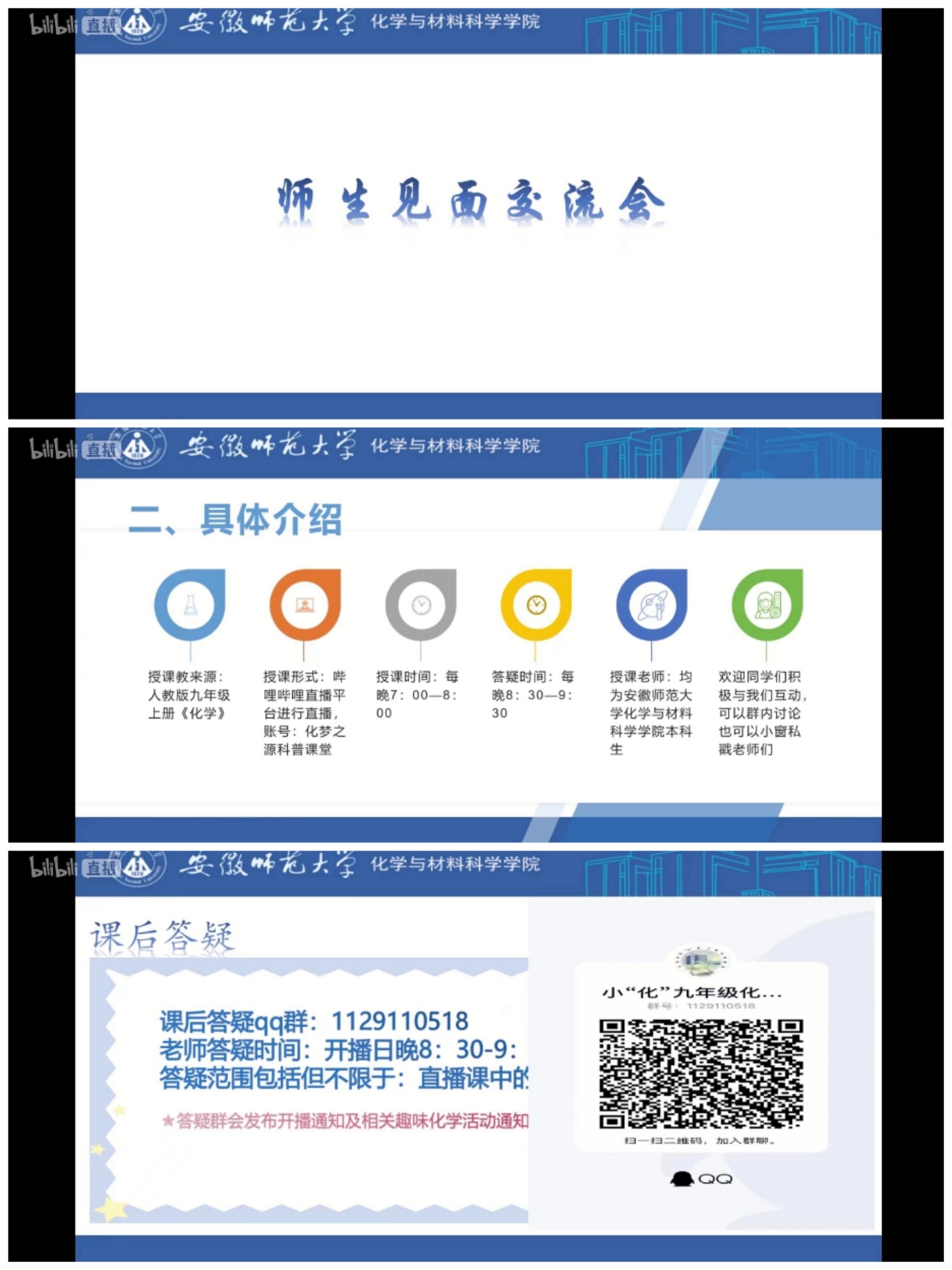 “化”梦之源科普课堂主题团队正式开始了线上科普课堂实践活动的第一节课,本次活动以“爱心成就梦想,‘化'梦圆于云端”为主题,在哔哩哔哩直播平台面向八年级升九年级的学生开展线上化学科普课堂,借助互联网的优势,带领学生初步了解化学,走进化学世界。