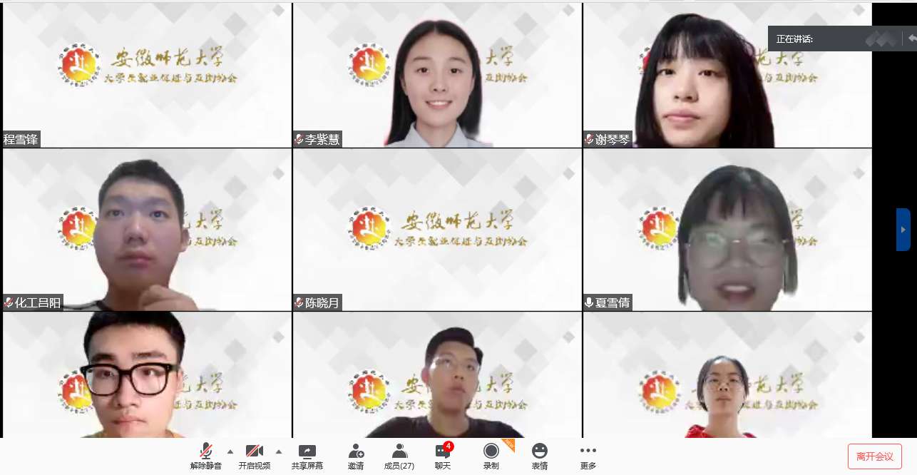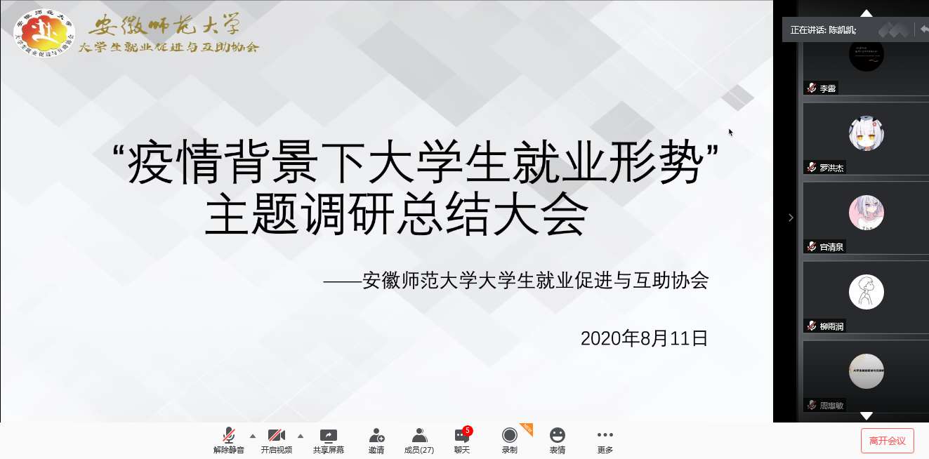 时美美)八月中旬将至,暑期社会实践活动也进入尾声,对于一场活动的结束,总结显得颇为重要。2〇2〇年8月11日晚上8点,安徽师范大学暑期“疫情背景下大学生就业形势”主题调研团队于线上召开实践总结大会,此次会议由队长陈凯凯主持,全体团队成员参会。
