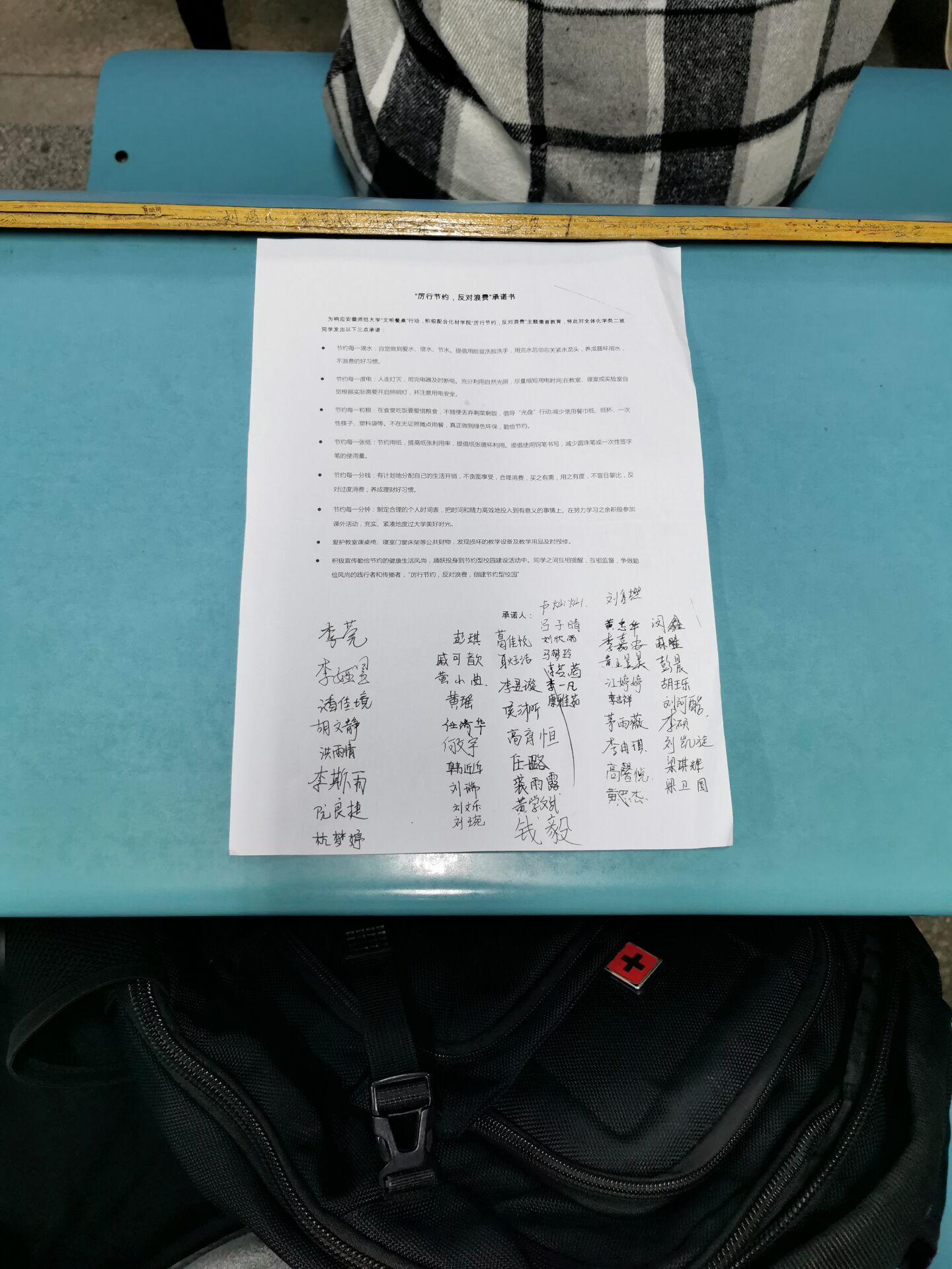 课下,部分班级团支部还集体签署了“厉行节约,反对浪费”承诺书,并开展了光盘行动的打卡活动,以实际行动将厉行节约内化于心、外化于行,推动形成“人人节约、文明就餐”的社会风尚。为营造浪费可耻、节约为荣的文明氛围,学院还通过宣传栏、微信公众号等各类宣传媒介,大力开展节约粮食、制止浪费的教育宣传。“一粥一饭,当思来之不易”,“半丝半缕,恒念物力维艰”……醒目的标语张贴在最显眼的位置,无不时刻提醒着就餐师生养成良好的节约习惯。