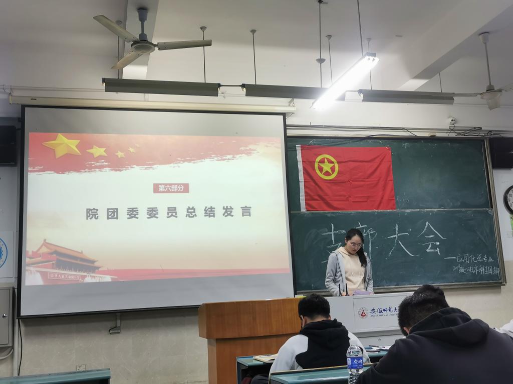 团支书董哲语围绕“学党史、强信念、跟党走”这一主题,通过一段由人民日报特别策划发布的的建党百年主题视频,引出本次大会的第一项——学习习近平总书记《论中国共产党历史》。团员青年代表李敏约和李建峰2位同学进行了发言,分享了自己对于党团学习的经验和体会,并鼓励同学们以史为鉴,向优秀的先辈们学习,在学习和生活中接续奋斗。收获了同学们赞同的掌声。