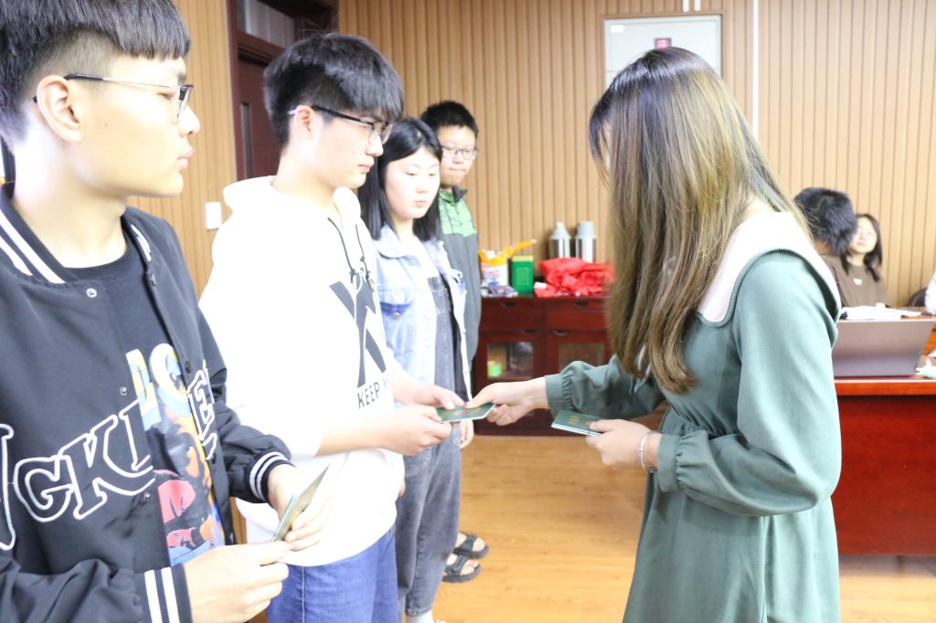 团委组织部部长王林新宣读新团员名单,团支书代表上台为新团员颁发团徽,团章和团员证。