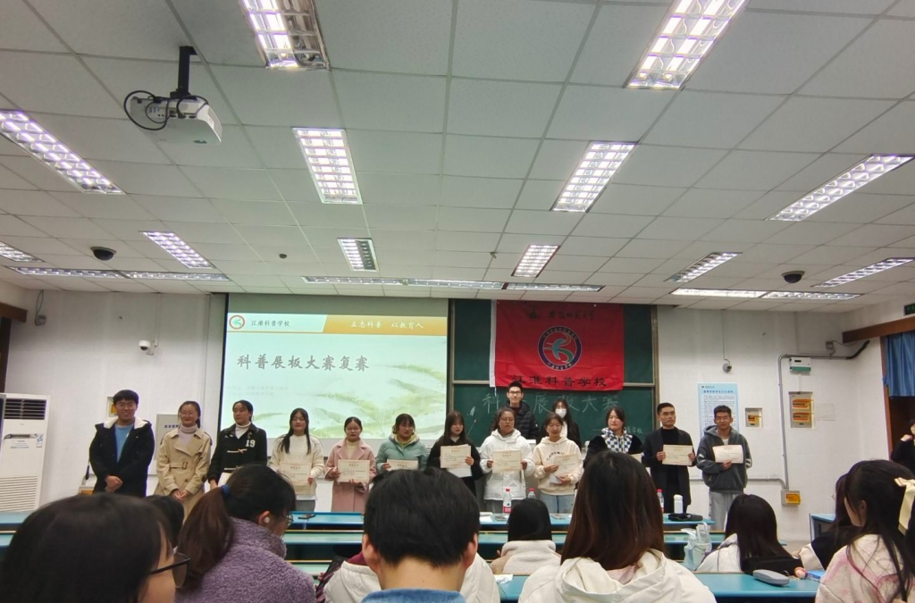施妍琦、杨俊娜)为激发学生对科学知识的学习兴趣,使同学们热爱生活、热爱科学,在2021年11月27日晚七点在2070401教室,江淮科普学校志愿服务组织举办科普展板大赛复赛。比赛得到芜湖市化学化工学会的指导和学院的大力支持,江淮科普学校副校长翁森翔、就业促进与互助协会会长陈慧娟、环境保护协会会长邵孟玉、教学基本功大赛一等奖获得者王宇阳、苦难辉煌征文比赛院一等奖获得者陶佳佳出席本次活动。