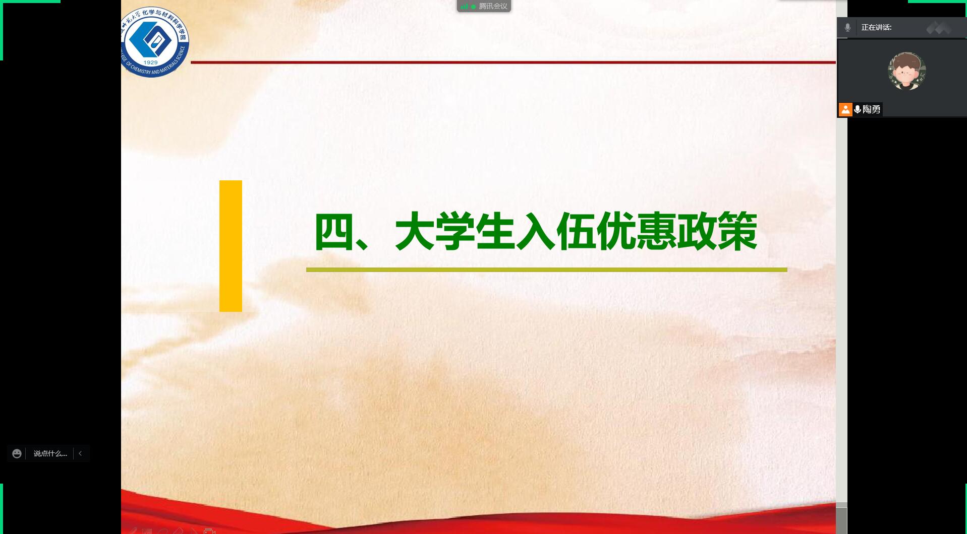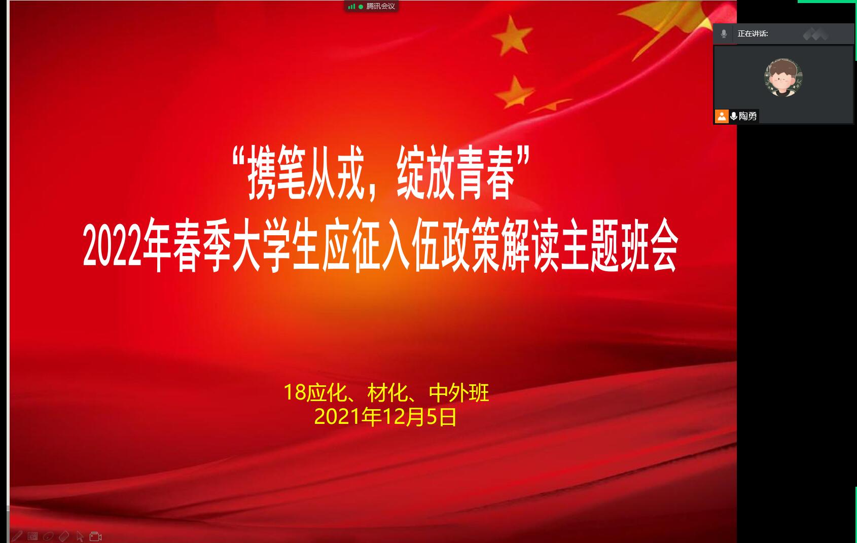 )为响应党和国家的号召,帮助同学们更加深刻地解读国家对于大学生应征入伍所出台的一系列优惠政策,鼓励更多有志学子应征入伍。12月5日晚,18应化、材化、中外开展“携笔从戎,绽放青春”——2022年春季大学生应征入伍政策解读线上主题班会,会议由辅导员陶勇主持召开。
