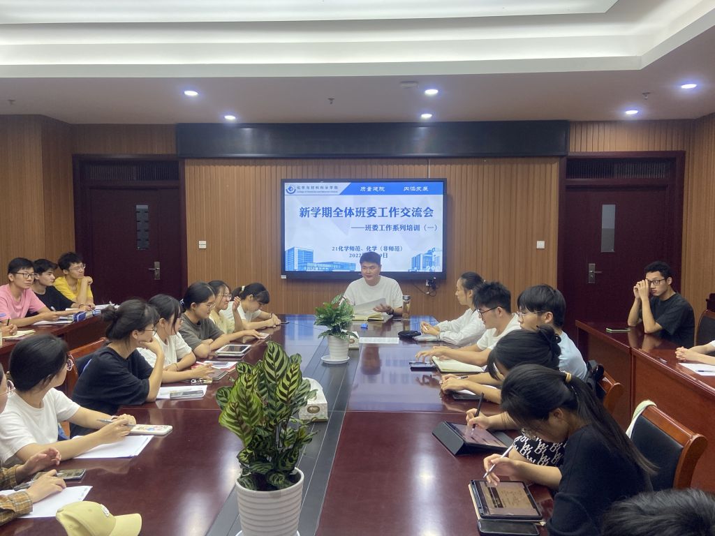 陈淑婷、陶勇)为做好新学期班级各项工作部署安排,加强各班学生骨干队伍建设,增强班级凝聚力,2022年9月19日晚,2021级化学(师范)、化学(拔尖人才班)全体新换届班委会成员在化材楼702会议室参加了新学期全体班委工作交流会,本次会议由辅导员陶勇主持。