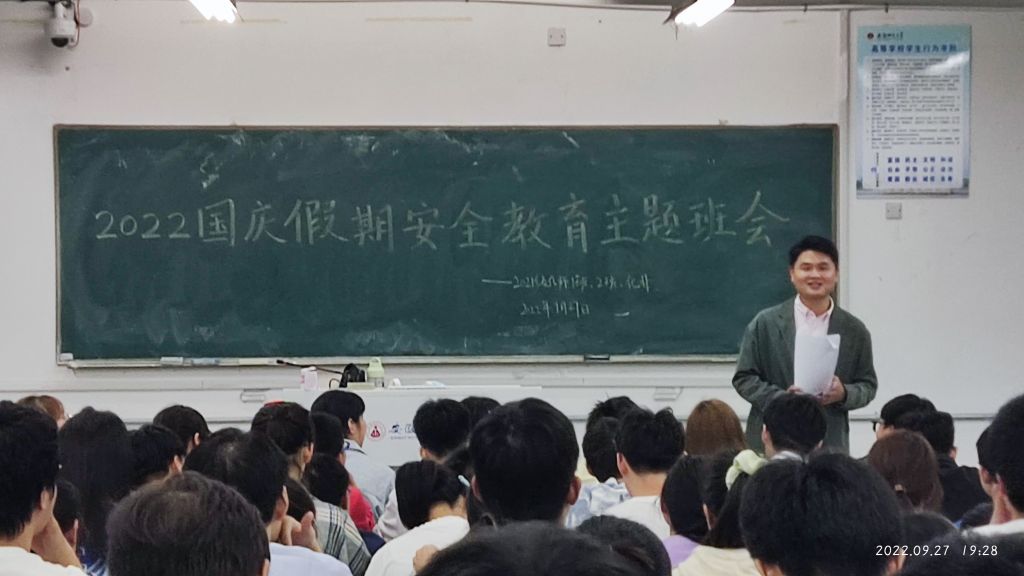 (江鑫滢、陶勇)为做好假期前后学生的各项教育安全管理工作,2022年9月27日晚,辅导员陶勇老师分别于2070101和2010201教室为21化师、化非专业全体同学召开2022年国庆假期安全教育主题班会。