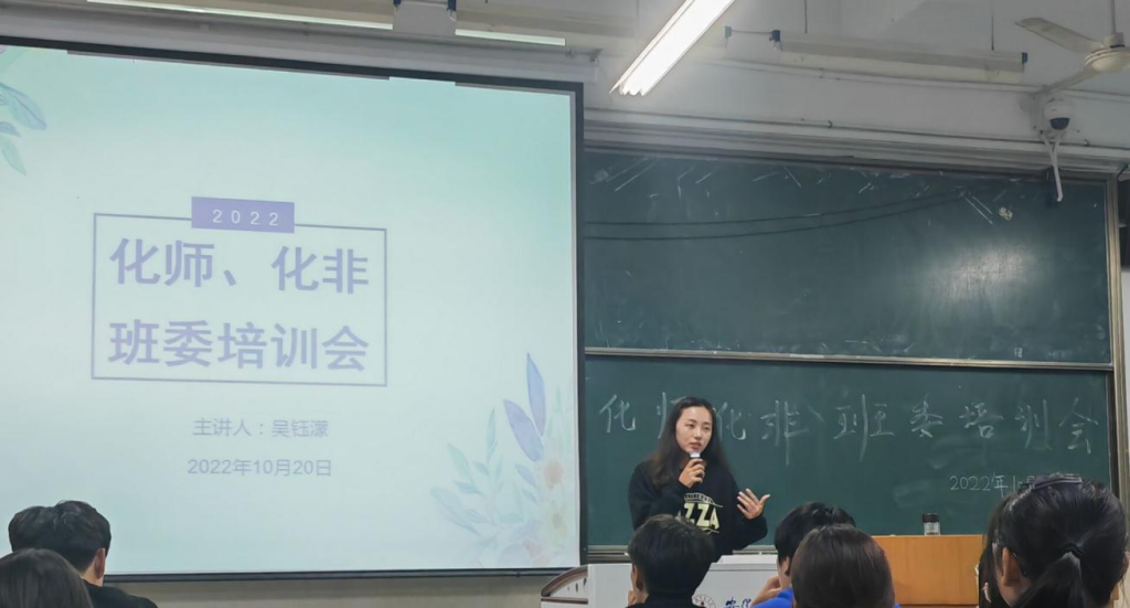 汪子欣)为进一步加强班级建设,充分发挥班委在班级建设中的作用,2022级化学师范及化学(拔尖人才班)专业于10月20日晚19点,在行知楼一号楼304教室开展班委培训会议。本次会议由2022级辅导员吴钰濛主持,2个专业5个行政班全体班委参加。