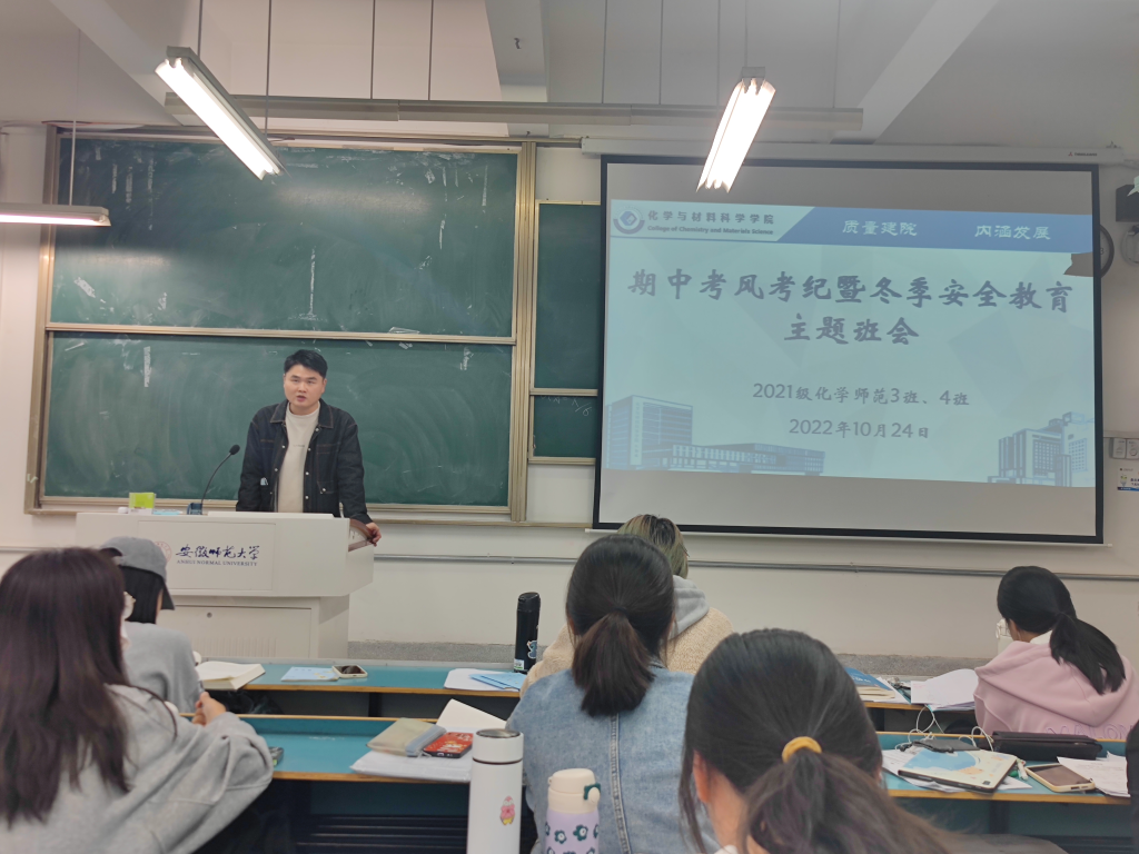 杨妍、陶勇)为缓解备考压力,调动同学们期中考试周学习积极性,2022年10月24日-26日,辅导员陶勇老师分别为21化师、化非专业全体同学开展期中考风考纪暨冬季安全教育主题班会。