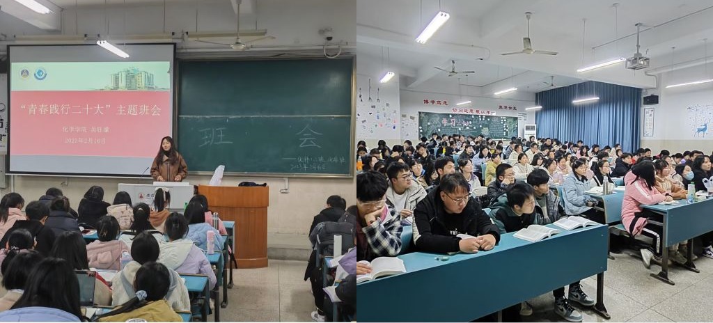 汪子欣)为引导广大青年厚植爱党、爱国、爱社会主义情感,传承红色基因,深入学习宣传党的二十大精神,2023年2月16日晚,2022级化学师范专业三、四班在1号行知楼302、303室开展以“青春践行二十大”为主题的班会教育,本次活动由2022级辅导员吴钰濛主持。