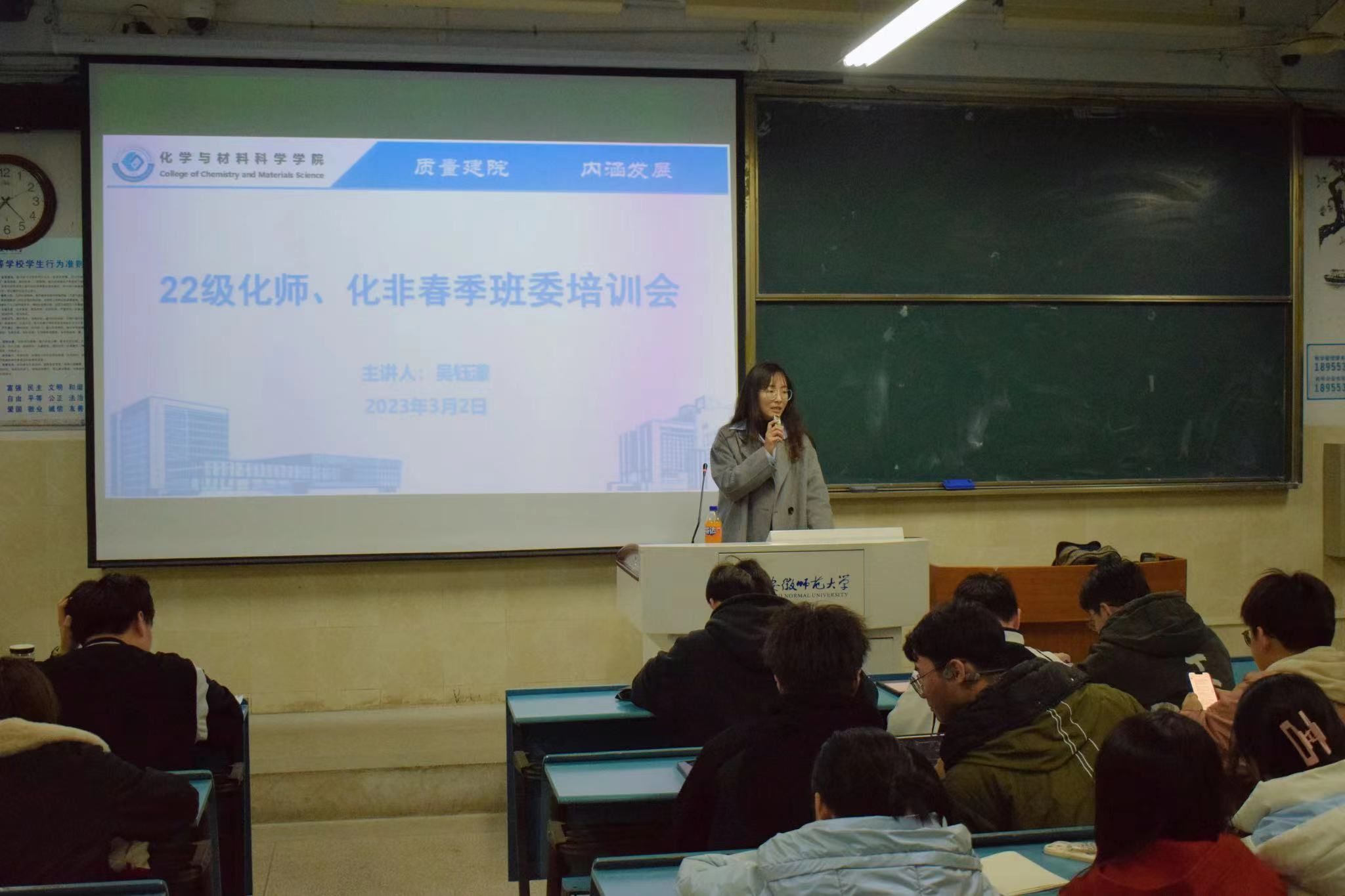 曹婧怡、吴钰濛)为提高班干部的工作能力,强化各班委团结合作能力,增强班委的带头意识,3月2日晚7:30,在1号楼201开展22级化师、化非专业班委培训会。本次培训会由辅导员吴钰濛主持,22级化师、化非班全体班委参会。