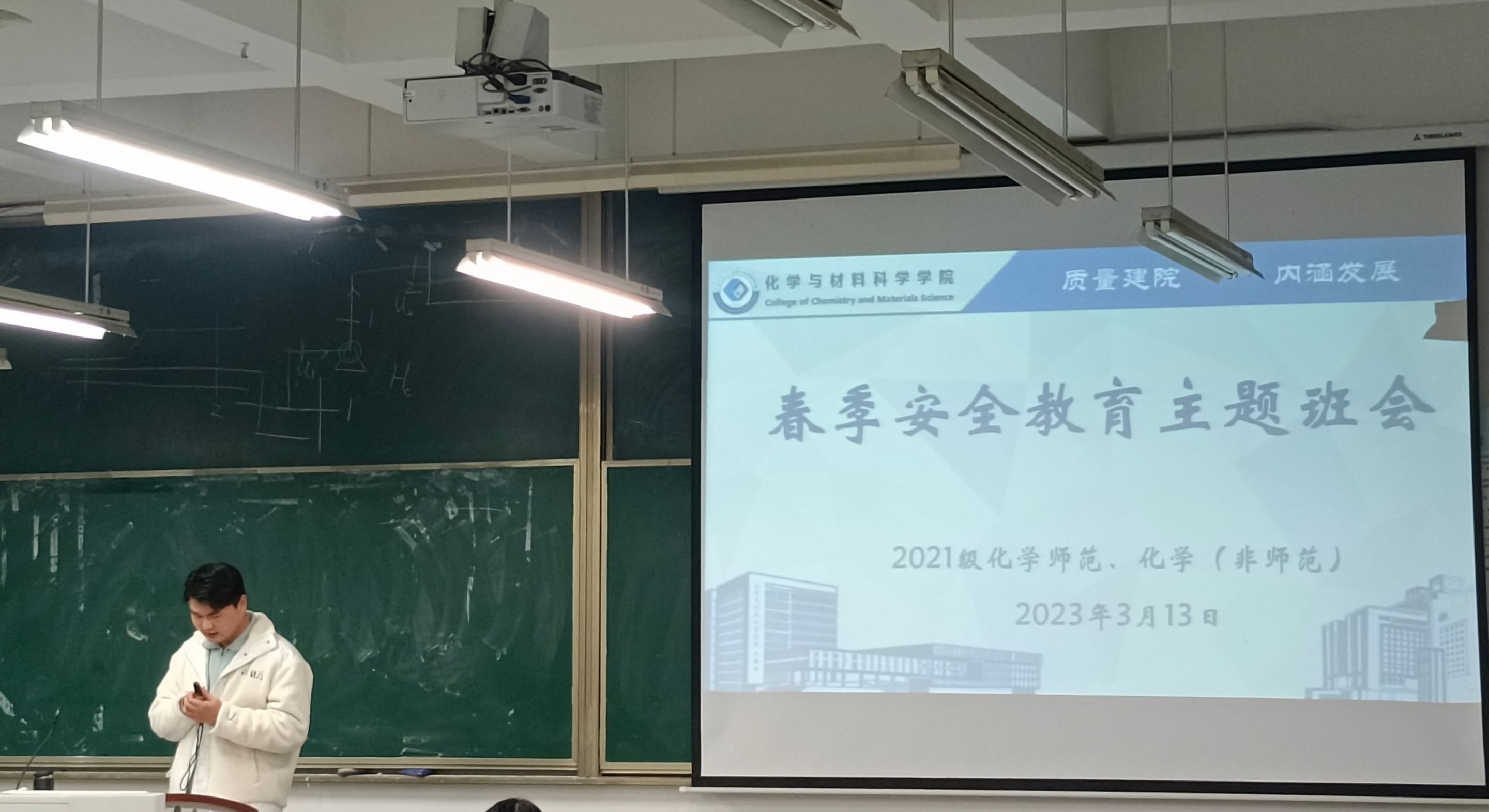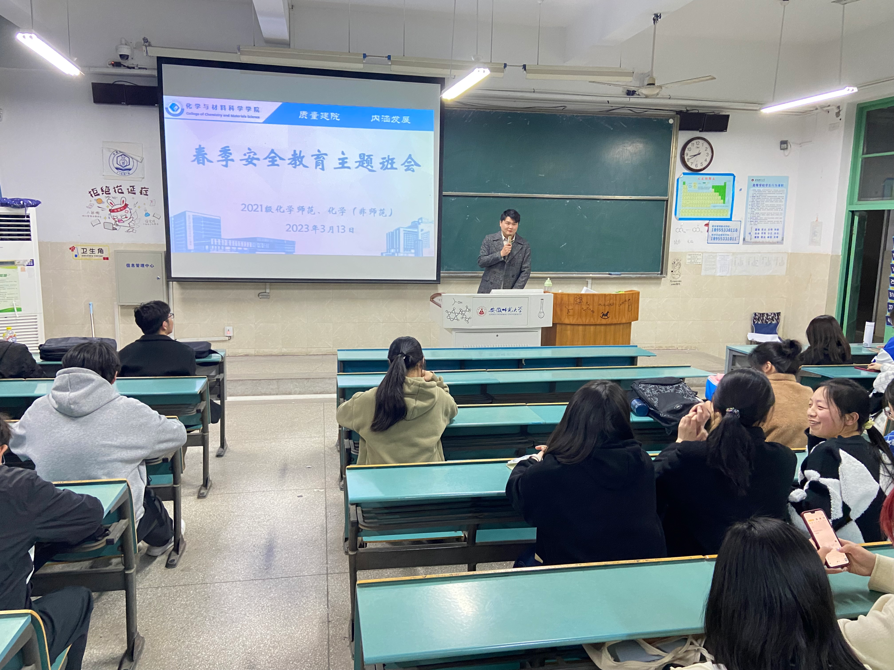 )为加强春季学生安全意识,防范潜在危险,增强学生社会认知能力,普及疾病防控、网络安全、交通、饮食、财产等安全常识,21化师、化非专业于2023年3月13、14日在辅导员陶勇老师的带领下召开了以“春季安全教育”为主题的班会。