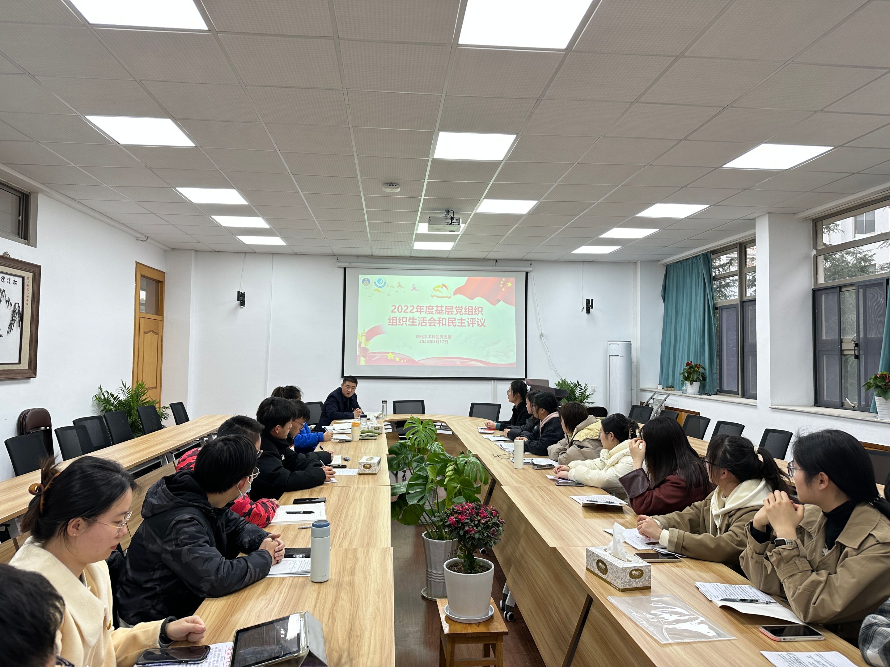 赵蒙蒙、王芳)3月17日下午,应化系本科生党支部在学苑北楼9号楼205会议室召开2022年度基层党组织组织生活会暨民主评议党员大会,会议由支部书记王芳主持,学院党委副书记李古州作为普通党员参加会议,应化系本科生全体党员参加了此次会议。