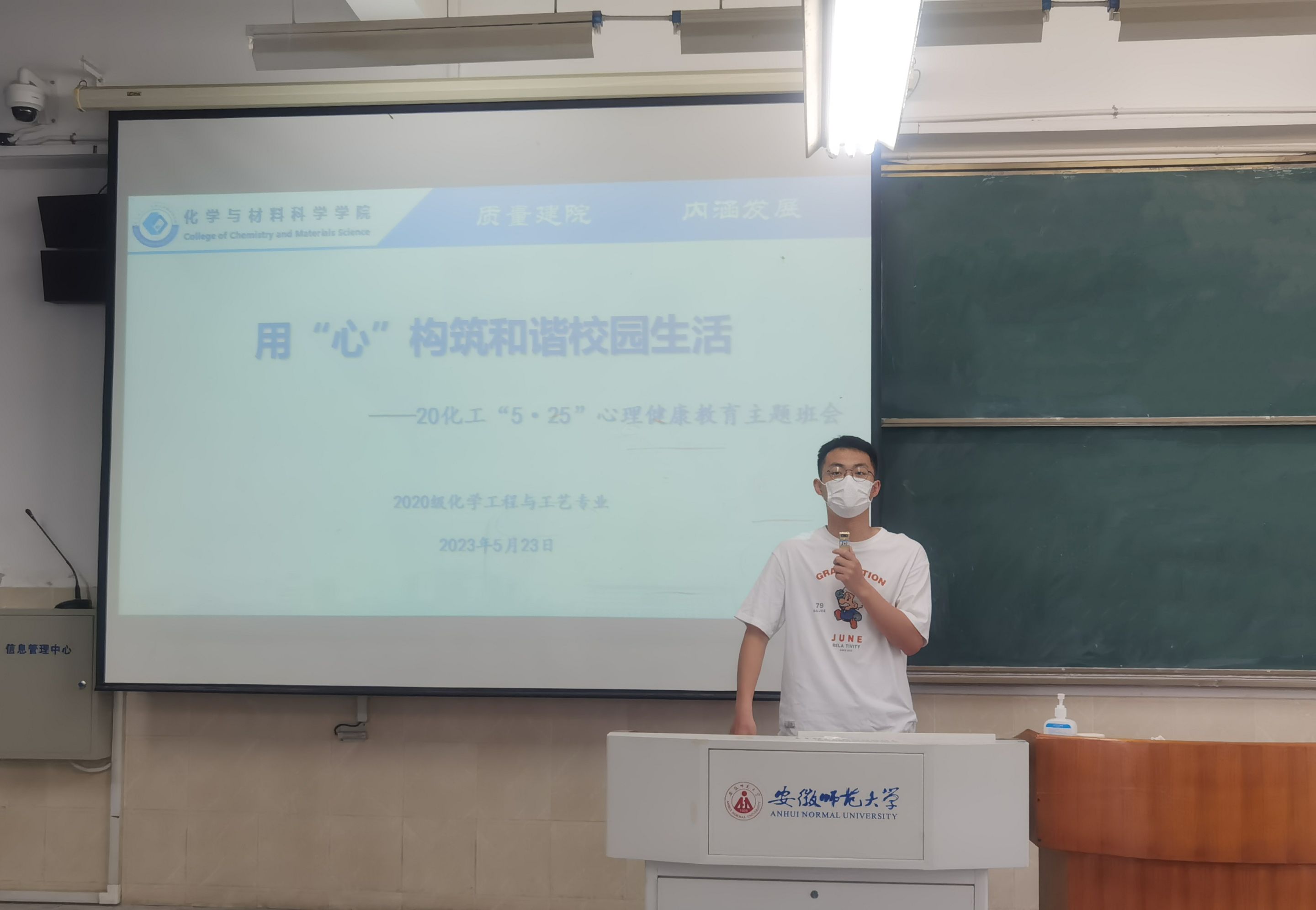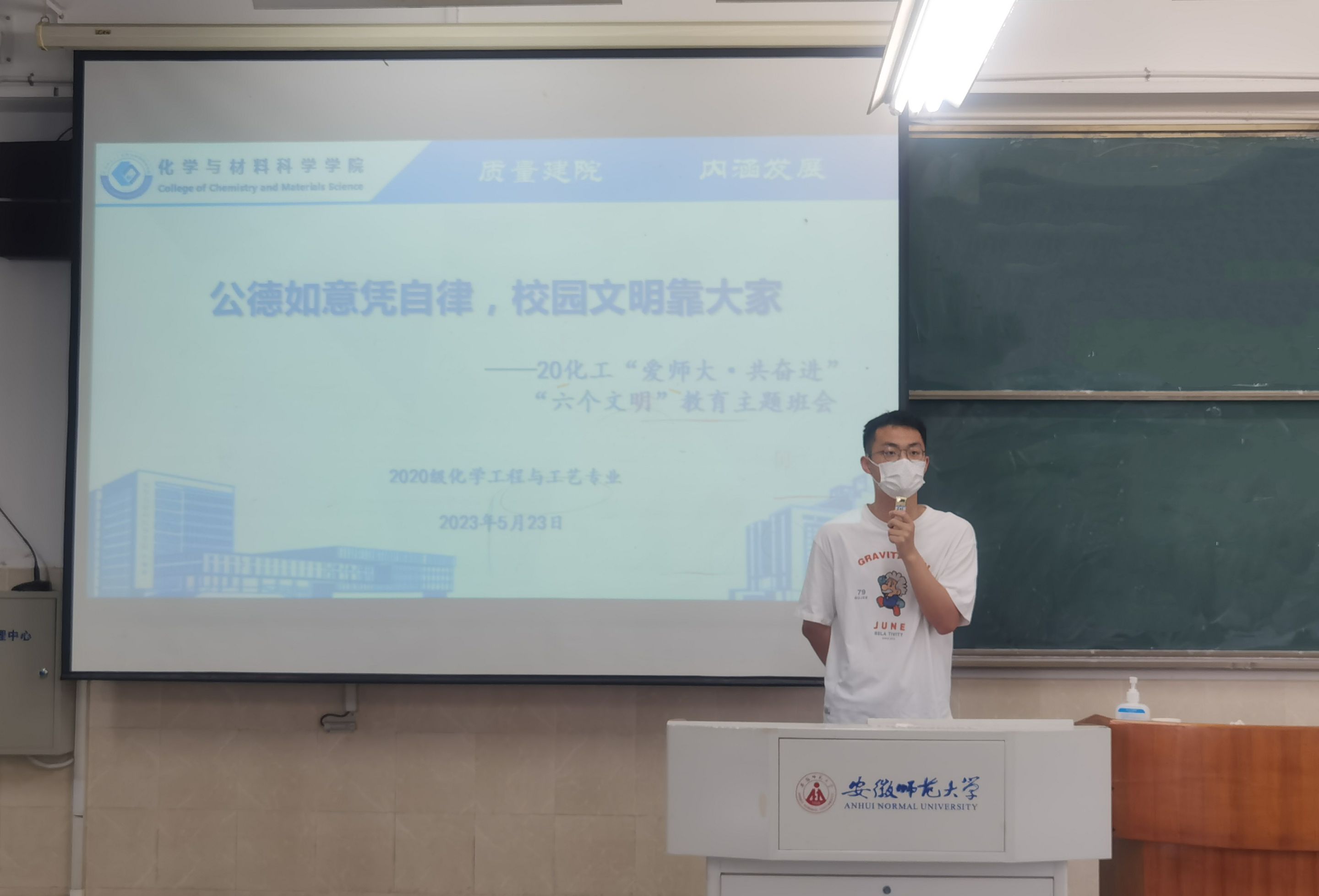 汪芙琳)为扎实推进“爱师大·共奋进”大学生“六个文明”教育实践活动,营造良好的班级氛围,积极关心关爱班级同学的心理健康,2023年5月23日上午在行知楼2010507教室,辅导员于洪翔为2020级化学工程与工艺专业的全体学生开展了主题为“公德如意凭自律,校园文明靠大家”校园文明暨“用‘心’构筑和谐校园生活”心理健康主题班会。