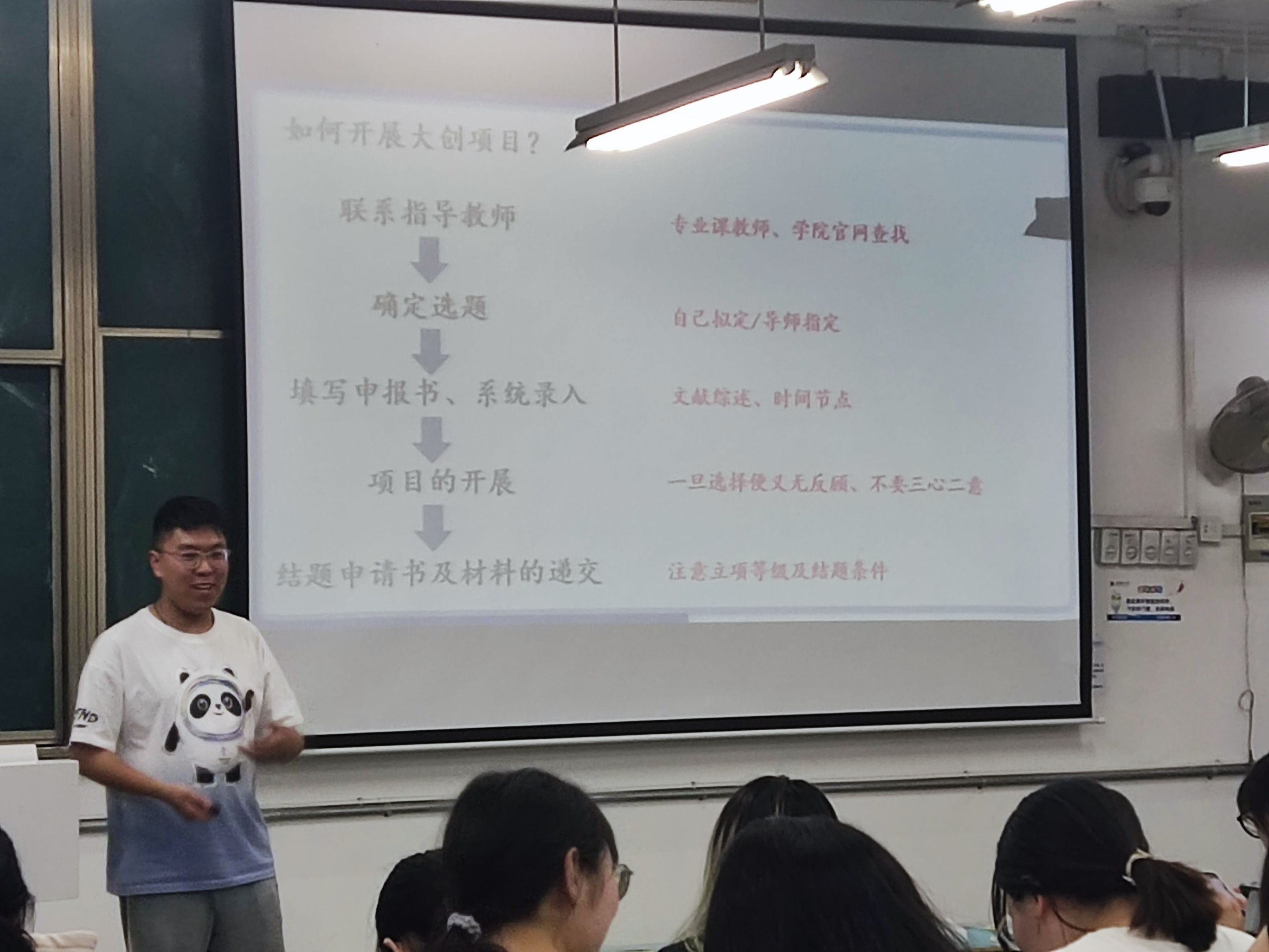 王宇阳首先向大家介绍了自己对各位导师们指导方向的认知,给有意向的同学提供初步参考方向。接着他着重强调了在大创申报和开展过程中需要尤其注意文明礼仪方面的问题,并结合实例给同学们提供了一些细节上的建议,如提前学习《文献检索》相关内容,学会材料撰写的规范;礼貌请教师兄师姐,汲取优秀经验;注重学术规范,不要弄虚作假造假等等。