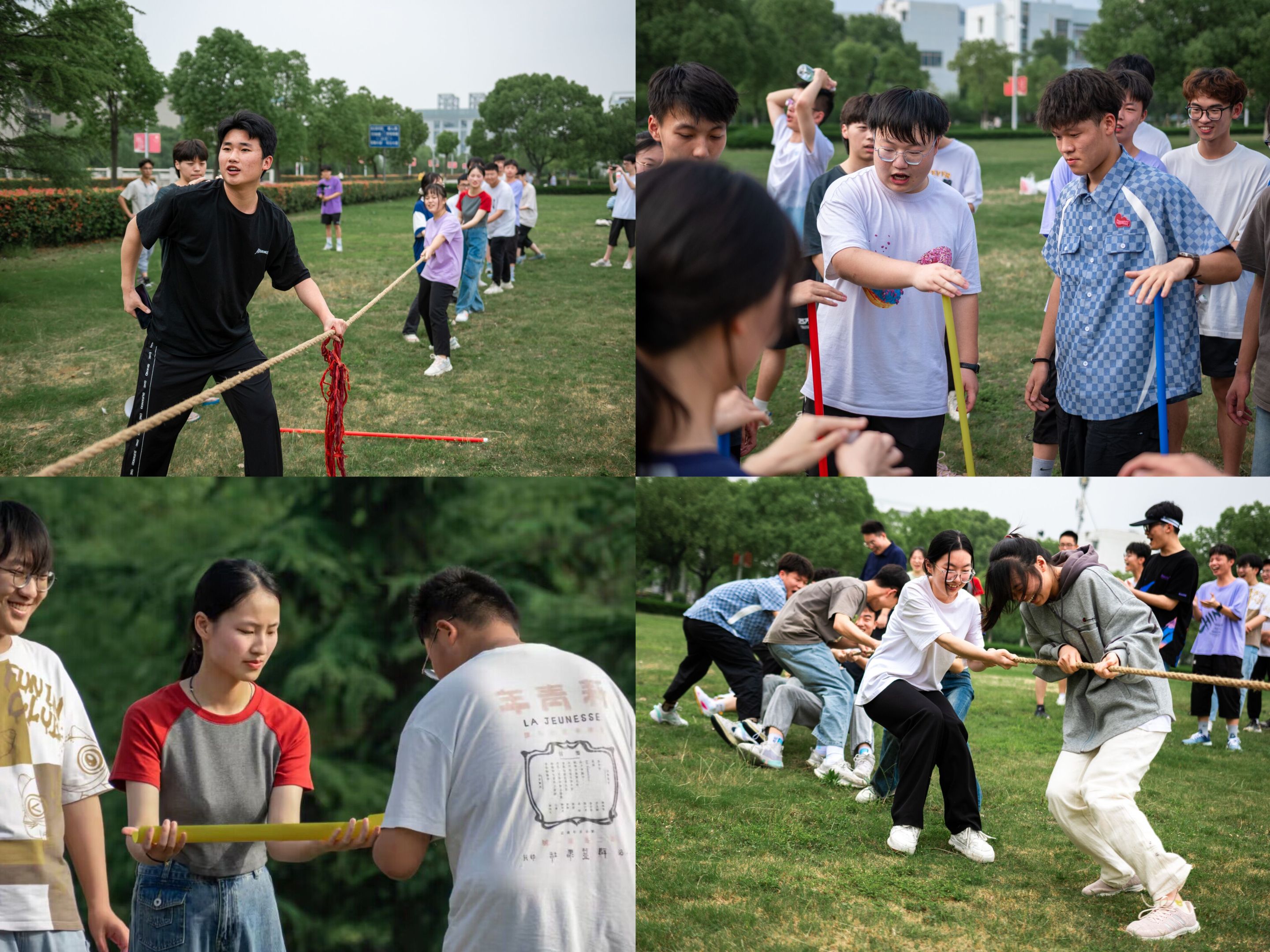 在活动中,学生社区的学生干部充分准备并组织了一系列富有挑战性的团队合作游戏,如“趣味拔河”、“珠⾏千⾥”、“不倒森林”和“扔沙包”等,通过分组竞赛的形式,同学们在有限的时间内面对各种任务和障碍,并共同寻找解决方案。这些任务既考验了学生们的智慧和创造力,也要求他们紧密合作、相互支持。学生们积极地参与其中,通过共同努力克服困难,取得了出色的成绩。