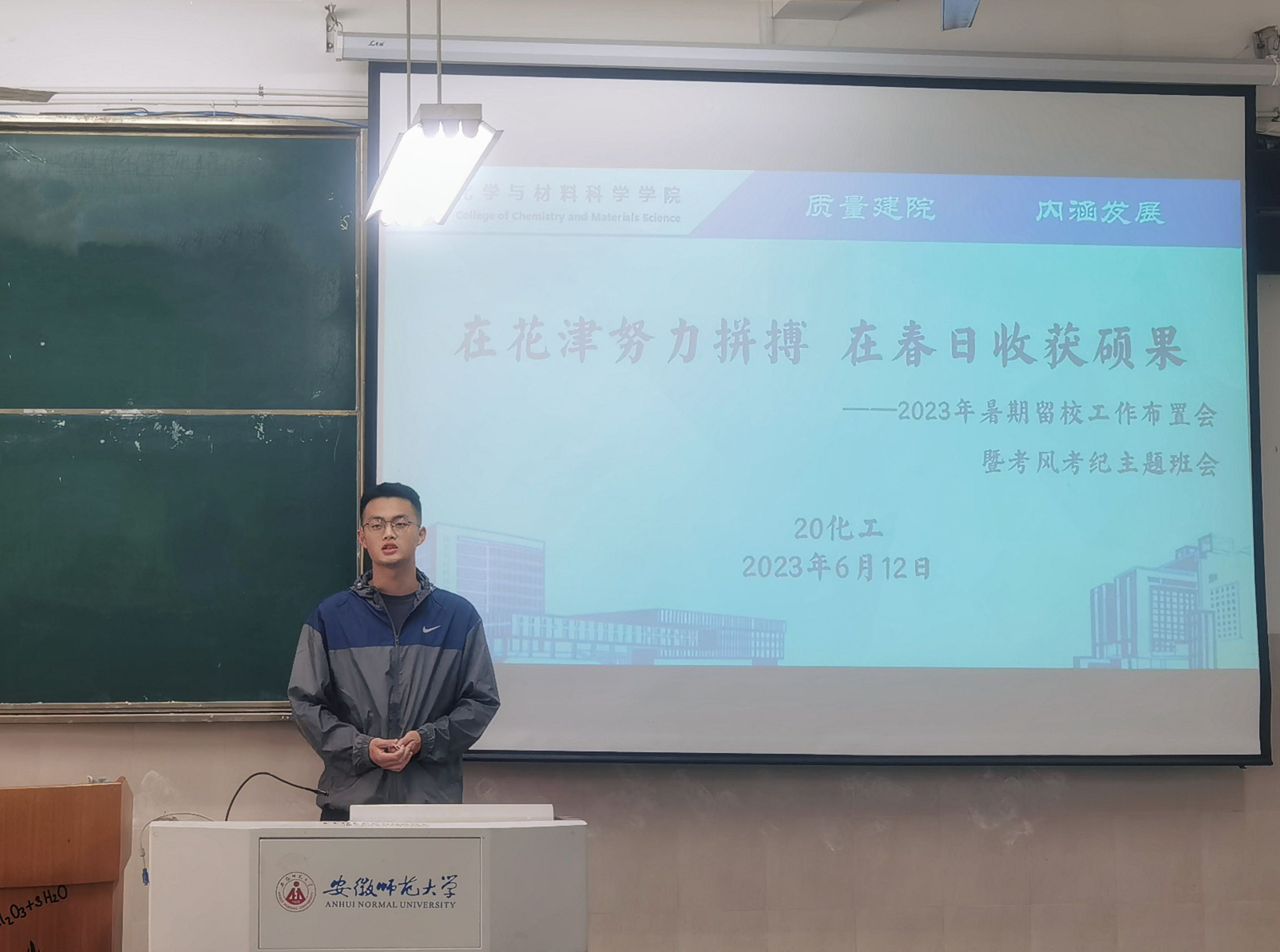 汪芙琳)为强化班级学风建设、严肃考风考纪,进一步落实保障暑期留校考研学生的正常学习和生活,确保暑假期间学生的人身和财产安全,营造良好的学习与生活氛围,2023年6月12日下午在行知楼2030103教室,辅导员于洪翔为2020级化学工程与工艺专业的全体学生开展了主题为“在花津努力拼搏,在春日收获硕果”2023年暑期留校工作布置会暨考风考纪主题班会。