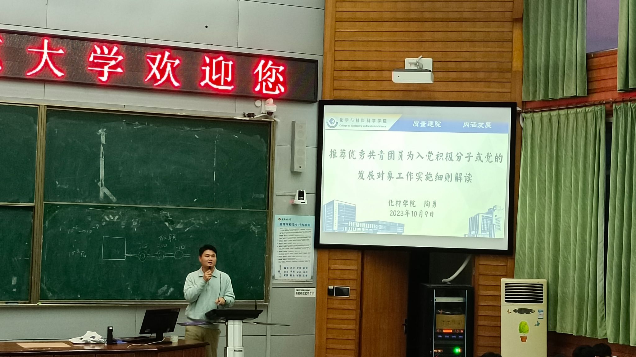 盛莹)为做好本学期入党“推优”工作,使化材学子充分熟悉“推优”工作的基本流程,鼓励更多优秀学子积极向党组织靠拢。10月9日下午,2021级化学(师范)、化学(非师范)专业在行知楼2010105教室开展推荐优秀共青团员为入党积极分子或党的发展对象工作实施细则解读主题班会,会议由辅导员陶勇主持。