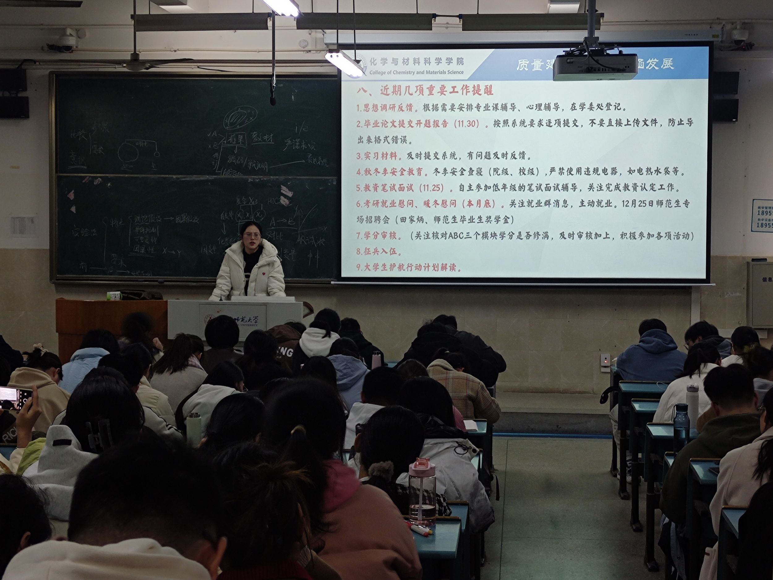 李莞 王芳)为确保毕业班学生各项工作有条不紊的安排落实,努力实现毕业班学生高质量考研、就业以及筑牢安全防线。11月16日,2020级化学师范、应用化学和化学非师范专业在行知楼2010301举行秋冬季安全教育暨学院护航行动主题班会,会议由辅导员王芳主持。