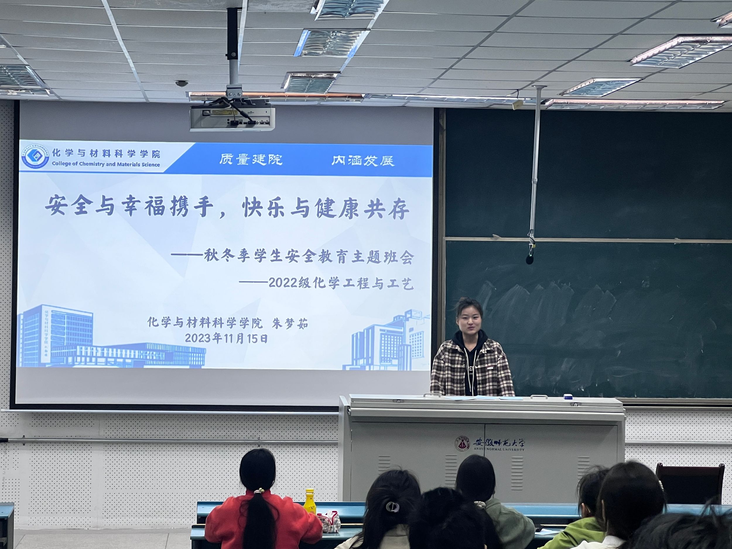 朱梦茹 郁妍)2023年11月15日晚上,化学工程与工艺专业在7号楼401教室开展了秋冬季大学生安全问题班会,本次班会由辅导员朱梦茹老师主持,旨在加强大学生们的安全意识和自我保护能力,谨防秋冬季节所盛行的流行性感冒,并就宿舍违禁电器的使用对同学们做出提醒。