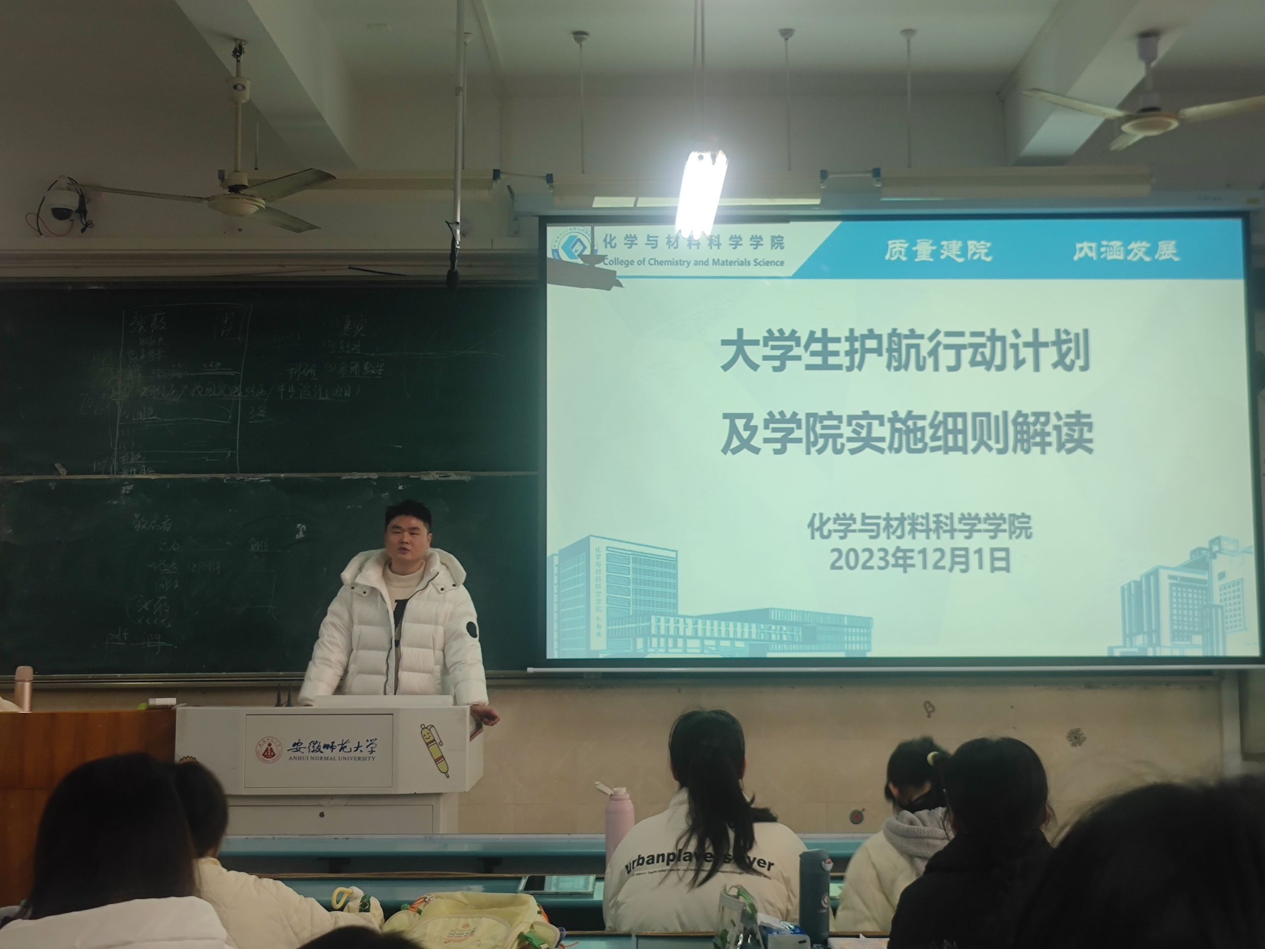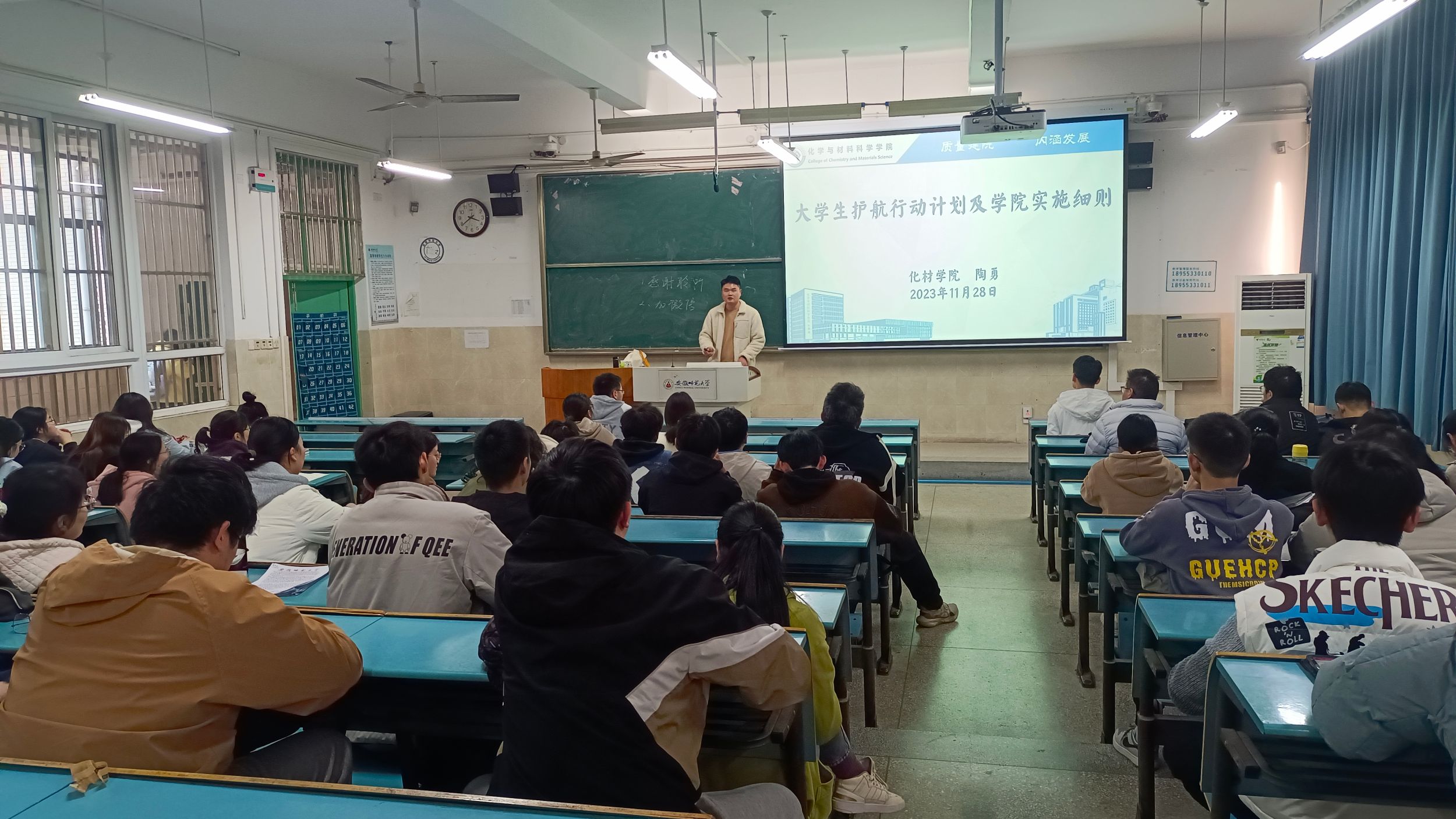 杨妍、陶勇)为深入了解学生思想学习生活等方面存在的问题,并为学生的全面发展提供良好保障,辅导员陶勇老师分别于2023年月28日、12月1日下午在行知楼2010302、303教室为2021级化学师范、化学非师范专业全体同学召开大学生护航行动计划及学院实施细则解读主题班会。