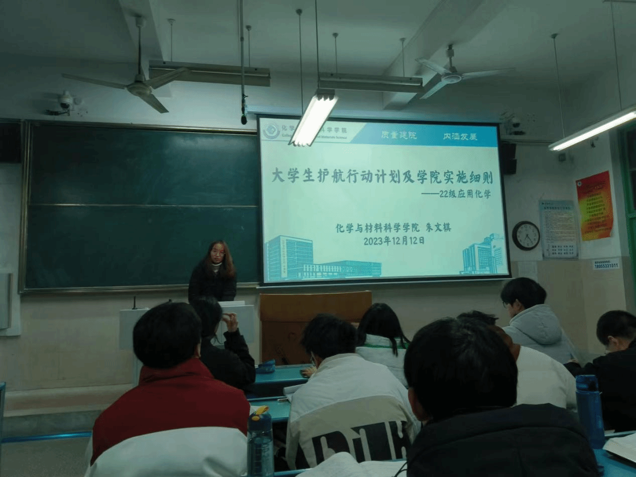 朱文棋、李晨蕾)2023年12月12日晚七点在2030103教室,2022级应用化学专业在辅导员朱文棋的主持下召开大学生护航行动主题班会,该班会辅导员朱老师为大家介绍学校大学生护航行动计划及学院实施细则。