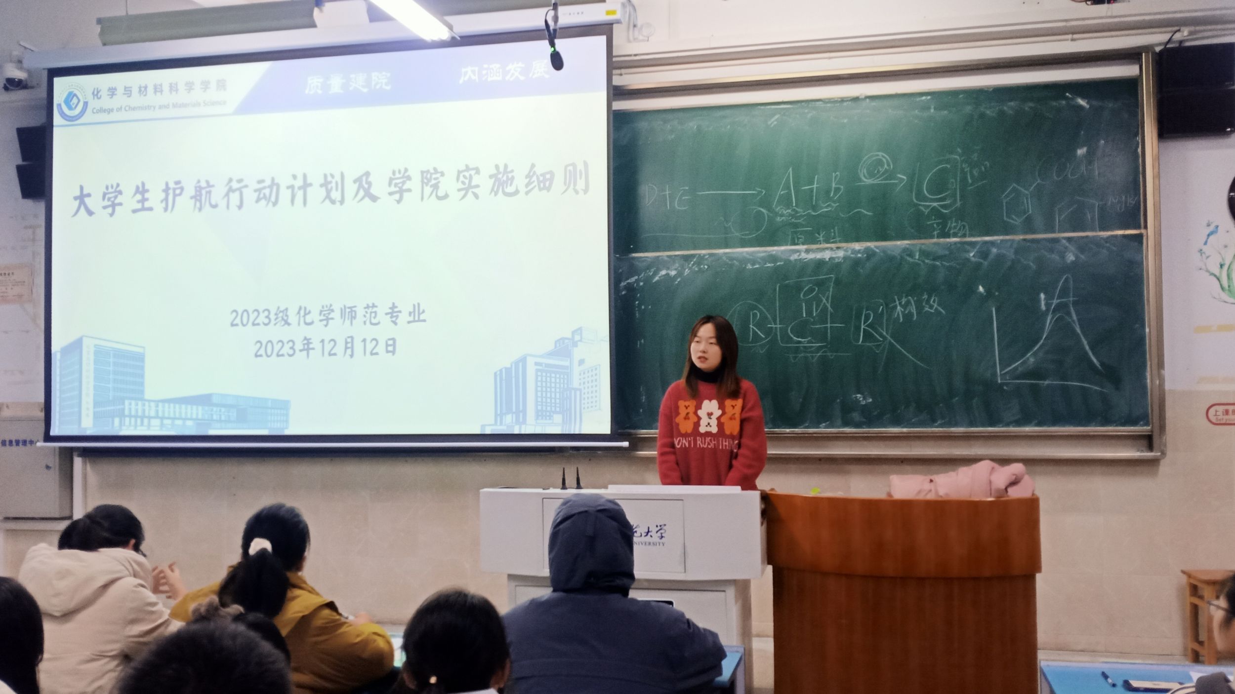 本网讯(张宏亮 王霞)为充分理解并贯彻落实大学生护航计划,2023级化学师范专业辅导员王霞老师于12月12日晚,在行知楼教室举行了大学生护航计划及学院实施细则解读班会,23级化师专业全体学生参会。