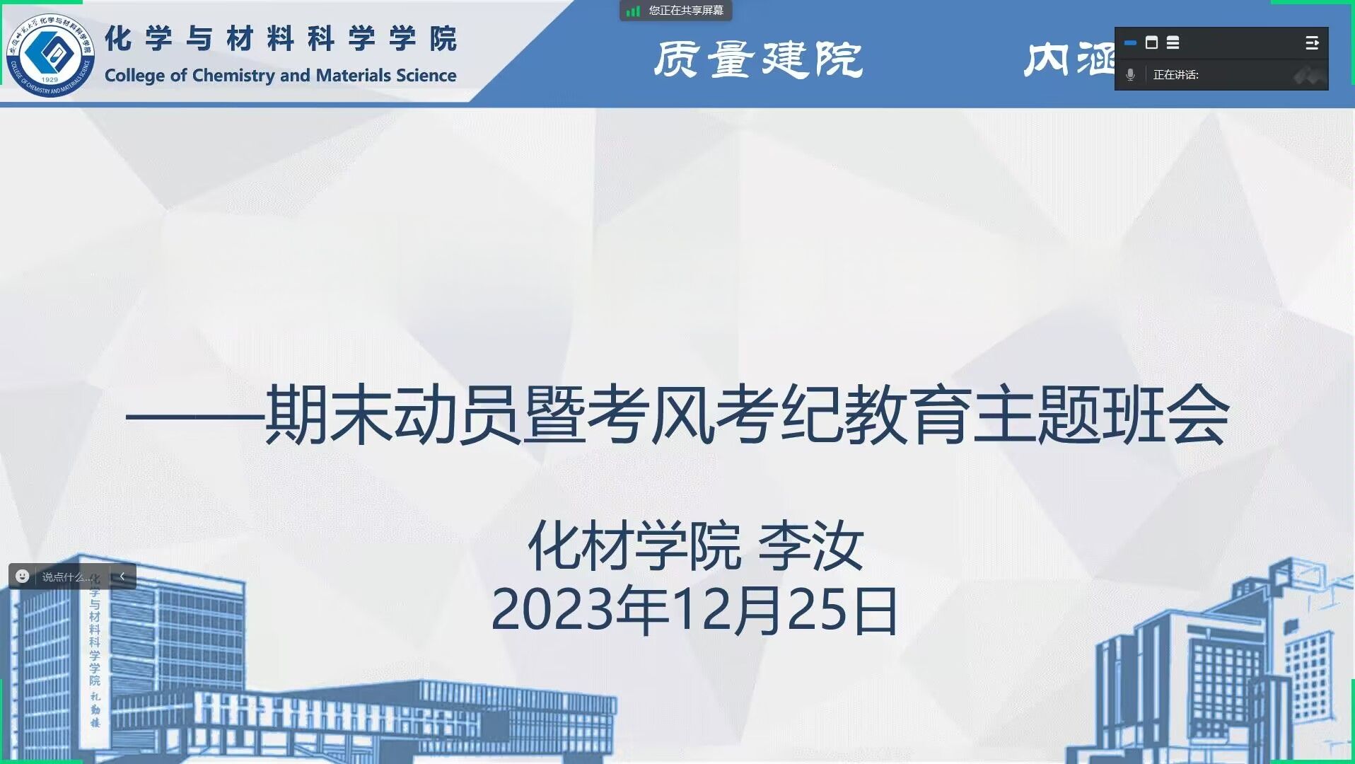 李汝)在期末考试来临之际,2022级材料化学专业于2023年12月25日召开了以“诚信赴考,共筑考试良好风气”的线上期末动员暨考风考纪教育主题班会。此次班会由辅导员李汝主持,面向该专业的全体学生,旨在向学生强调要遵守考场纪律,熟知违纪及作弊的认定办法,并鼓励学生们认真备考,共同营造一个良好的考试环境。