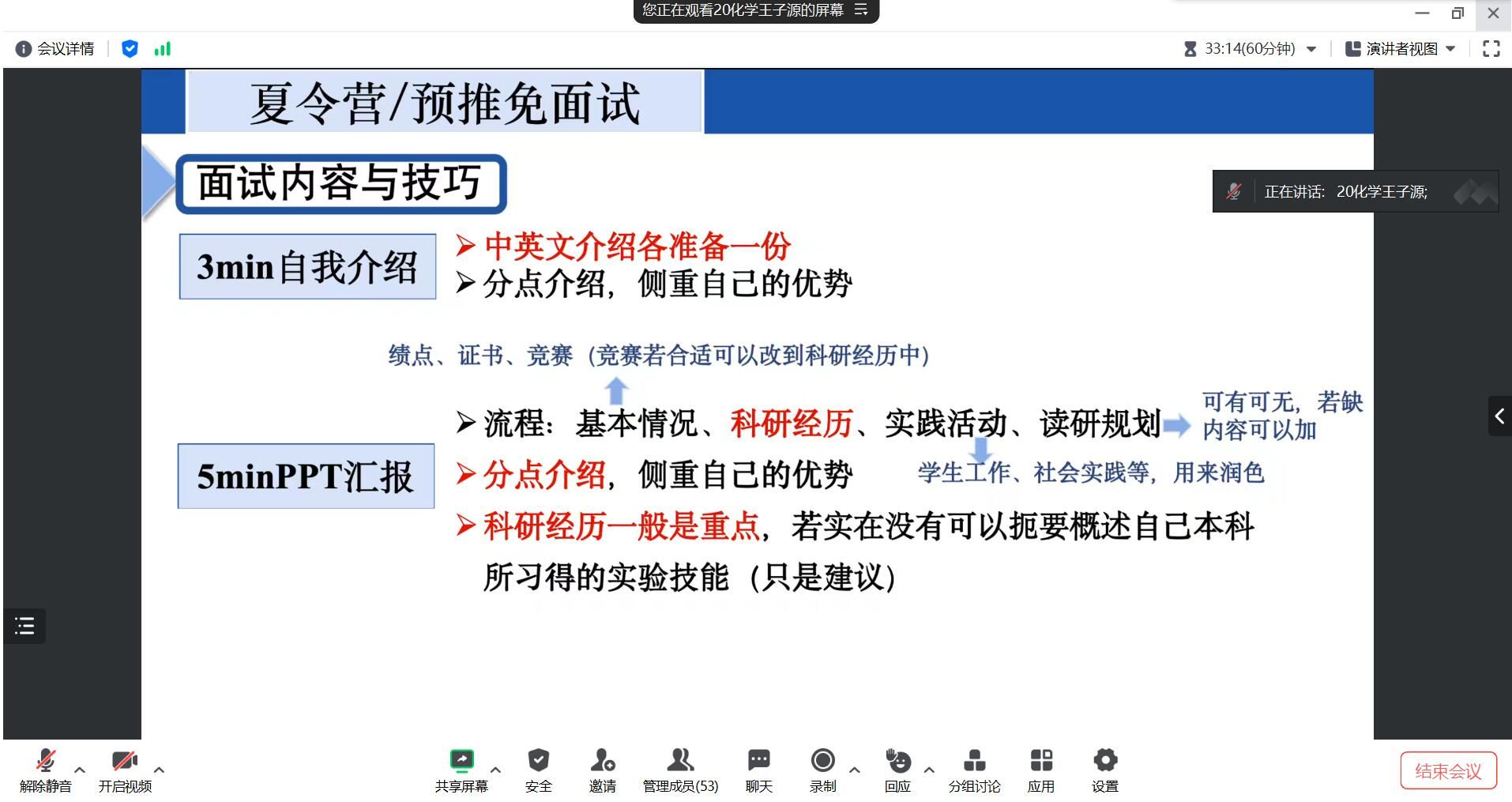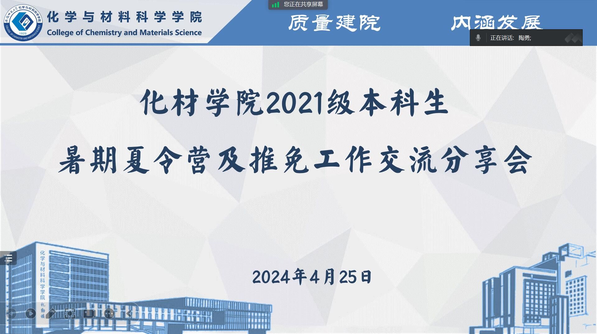 班会之后,陶勇利用腾讯会议举办了2021级本科生暑期夏令营及推免工作交流分享会,本次活动邀请了学院2024届获得推免资格的胡悦悦、王子源及2022届推免生、现就读于中国科学技术大学无机化学专业的黄宁宁三位同学分享获得推免资格的经验。会议由辅导员陶勇主持,篮球比分手机