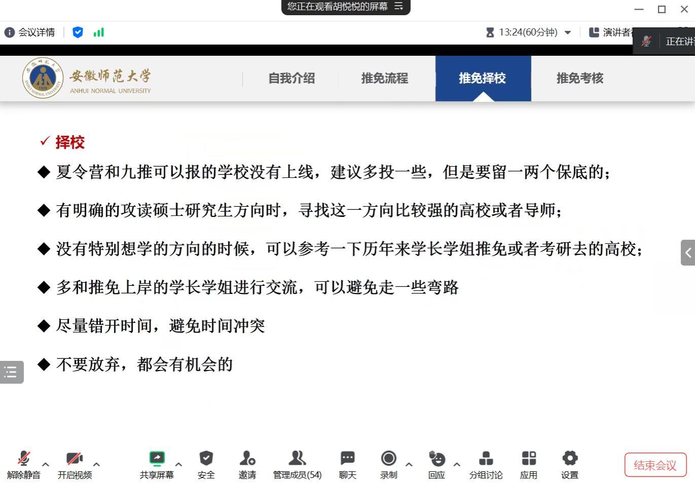 胡悦悦从推免流程、推免择校、推免考核三部分重点介绍了推免的基本流程和注意事项,她建议同学们应打好专业基础,积极各类学科竞赛,提高专业素养。王子源重点介绍了个人暑期夏令营相关经验及注意事项,他建议同学们多关注学校的政策文件,以便及时获取相关信息。黄宁宁结合个人两年的研究生学习经历,详细阐述了推免面试的注意事项及如何平衡好研究生期间的学业,鼓励同学们培养学术研究兴趣,保持优秀专业成绩。三位同学就推免的专业、高校、夏令营等内容与参会同学进行深入交流。