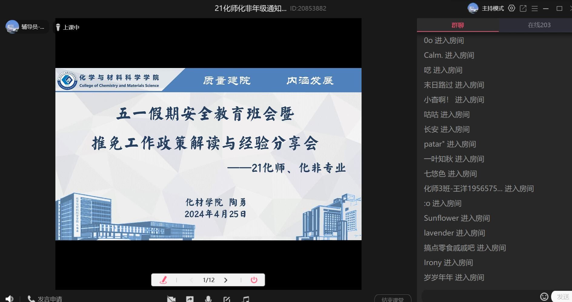 陶勇)为增强学生“五一”假期的安全意识,提高学生自我防护能力,4月25日晚,辅导员陶勇为21化学师范、化学非师范专业全体同学开展了2024年“五一假期安全教育暨推免工作政策解读与经验分享会”,全体同学线上参会。