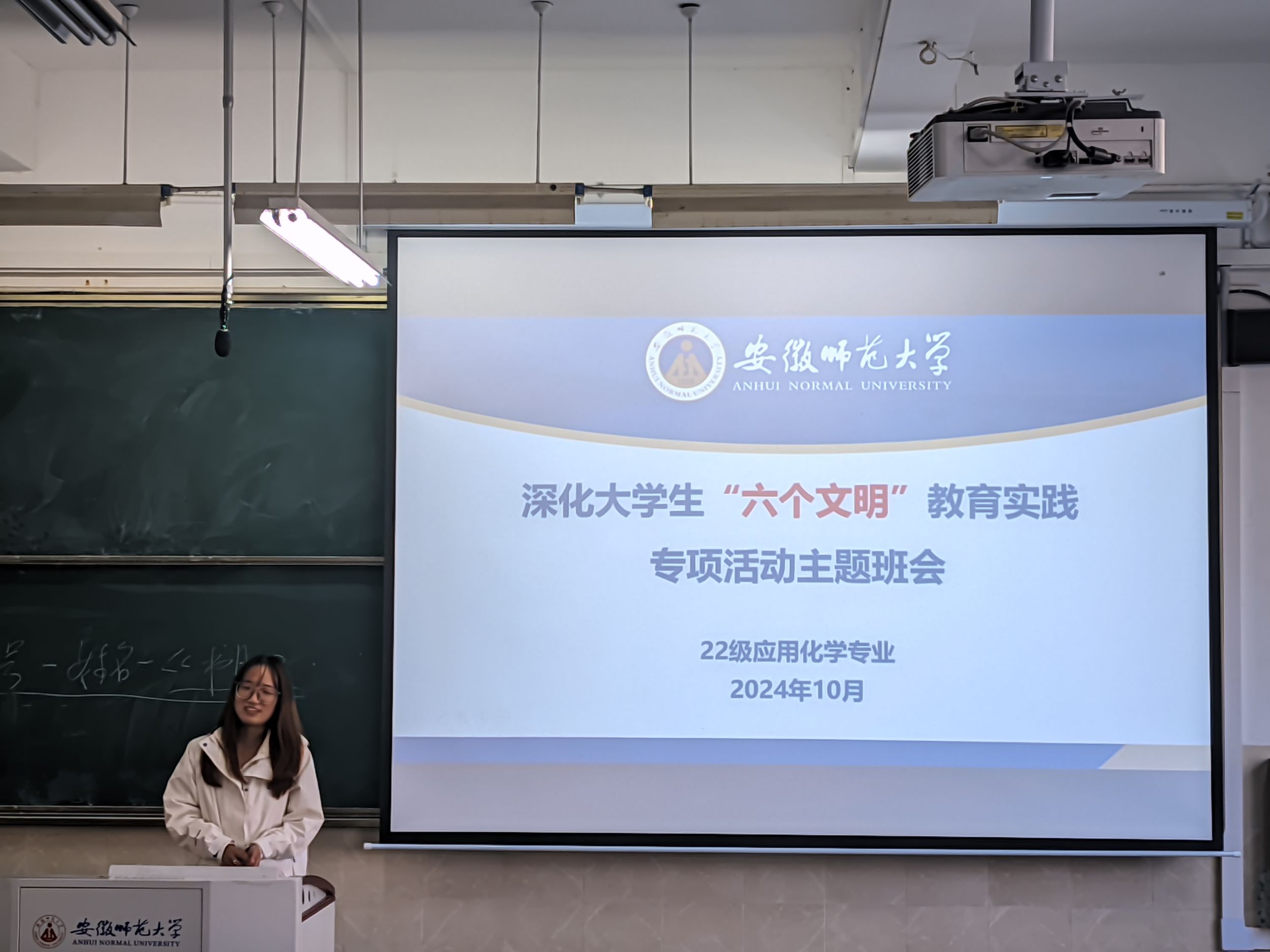 为深入学习贯彻党的二十届三中全会精神,积极学习习近平总书记考察安徽讲话精神,22级应用化学专业于10月23日下午在2010408举办深化大学生"六个文明"教育实践专项活动主题班会。此次班会由辅导员朱老师主持,她围绕班会主题,结合大学生实际,详细阐述了“六个文明”教育实践专项活动的重要意义和具体内容。