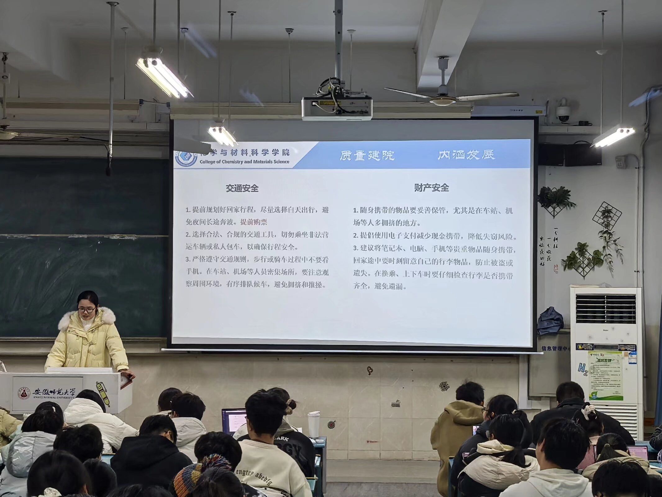 在安全教育方面,杨洋老师从宿舍安全、交通安全、财产安全、网络安全和人身安全五个方面就安全工作进行了安排,提醒同学们离校前落实落细宿舍安全检查,回家途中选择正规的交通工具,妥善保管好个人财物,警惕电信网络诈骗,不随意透露个人信息,提高自我防范意识。最后,杨洋老师还对近期的班级工作进行了梳理,就寒假放假时间、离校登记等相关问题进行了详细说明。