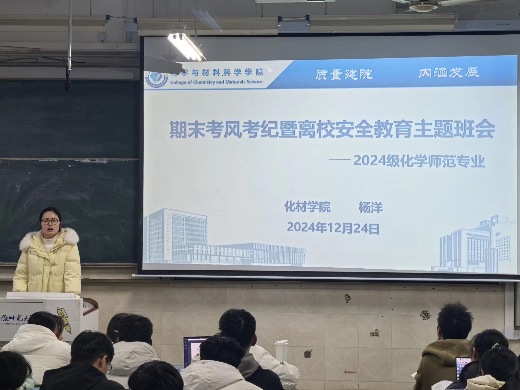 为做好期末考前动员,督促学生积极备考,加强考风考纪教育,确保考试的公平公正性,同时为寒假安全离校工作做好准备,12月24日晚,杨洋老师为2024级化学师范专业学生召开考风考纪暨安全教育主题班会。