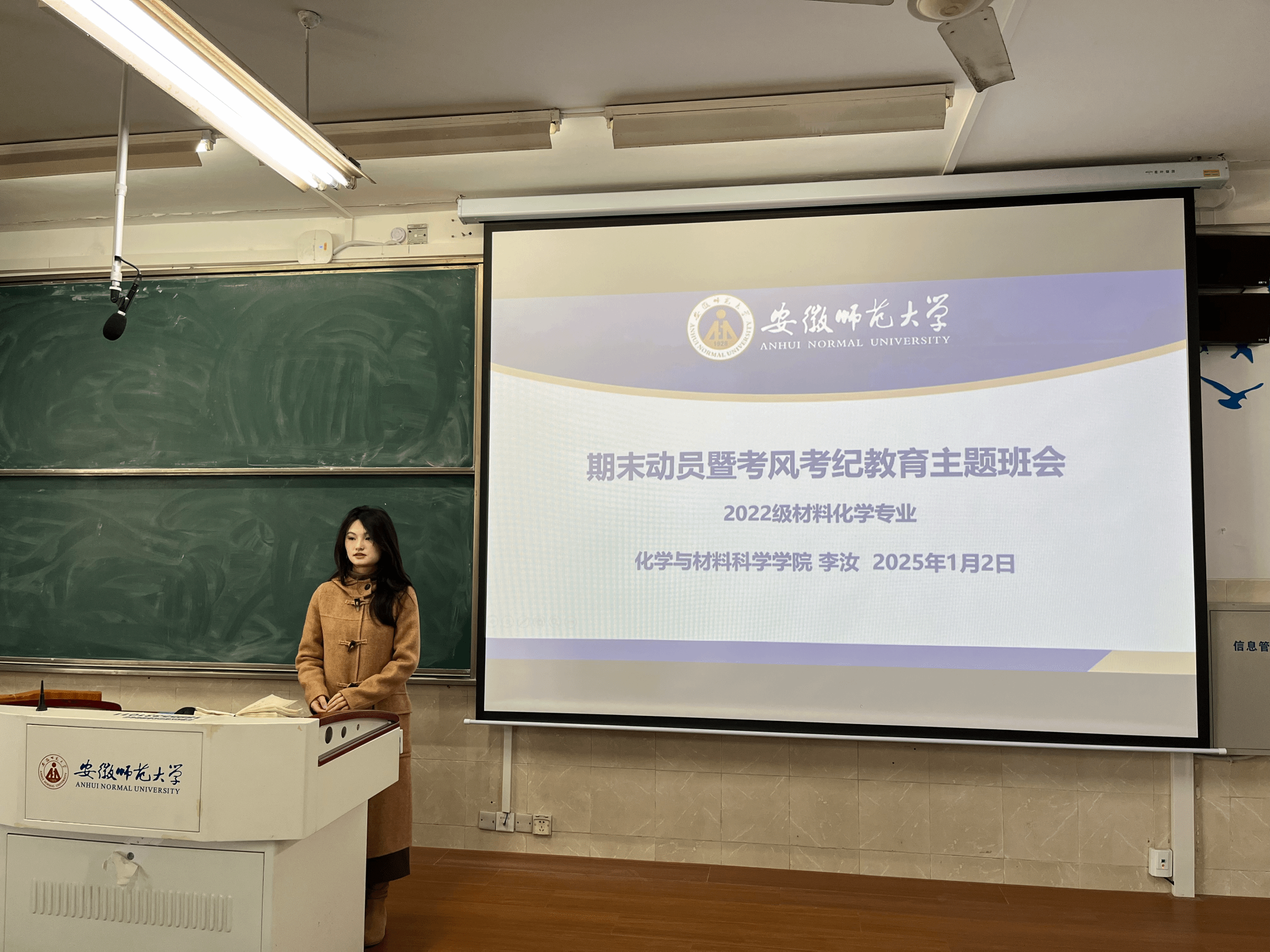 为帮助同学们做好期末复习准备,同时深入开展诚信教育,营造公平公正的考试环境,2022级材料化学专业于1月2日上午在2010603教室召开了“期末动员暨考风考纪教育主题班会”。此次班会由辅导员李汝主持,全体学生到场参与。