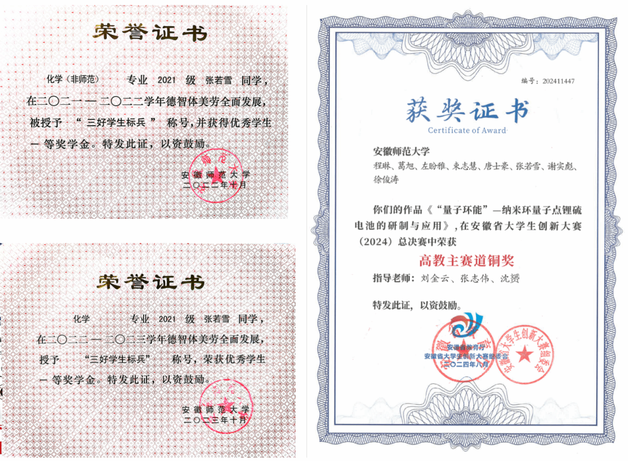 学业方面,她态度端正,刻苦努力。在校期间,保持三学年专业成绩、综合测评成绩专业第一,一次性通过英语四六级考试,曾获学业奖学金、科研达人奖学金,连续三年获得校优秀学生一等奖学金,多次获评“三好学生标兵”、“优秀团员”荣誉称号,现已推免至中国科学技术大学材料物理与化学专业。
