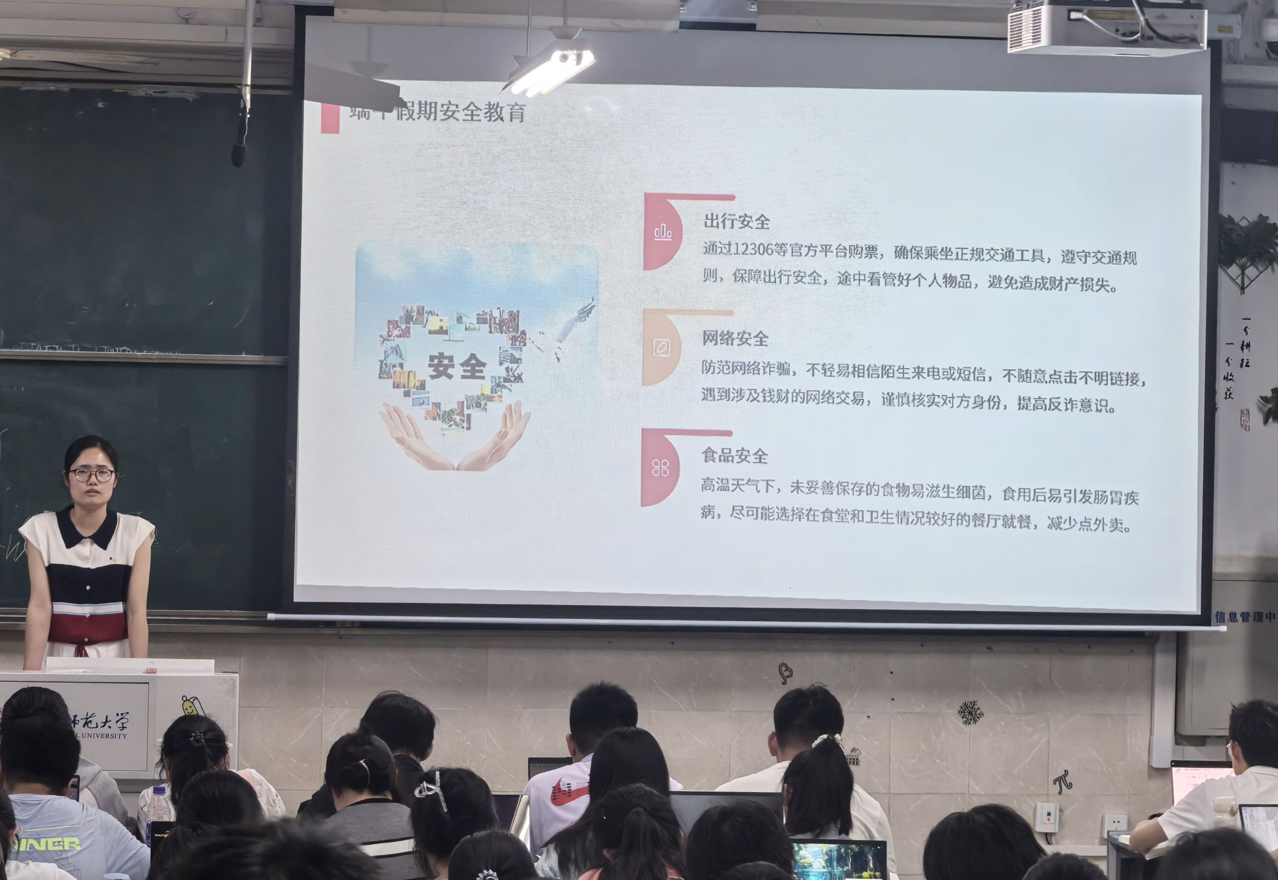 最后,随着夏季气温升高,溺水事故进入高发期,辅导员特别针对防溺水安全进行强调。她告诫同学们要远离陌生水域,游泳时务必选择正规、有安全保障的场所,并在专业人员陪同下进行,杜绝溺水悲剧的发生。