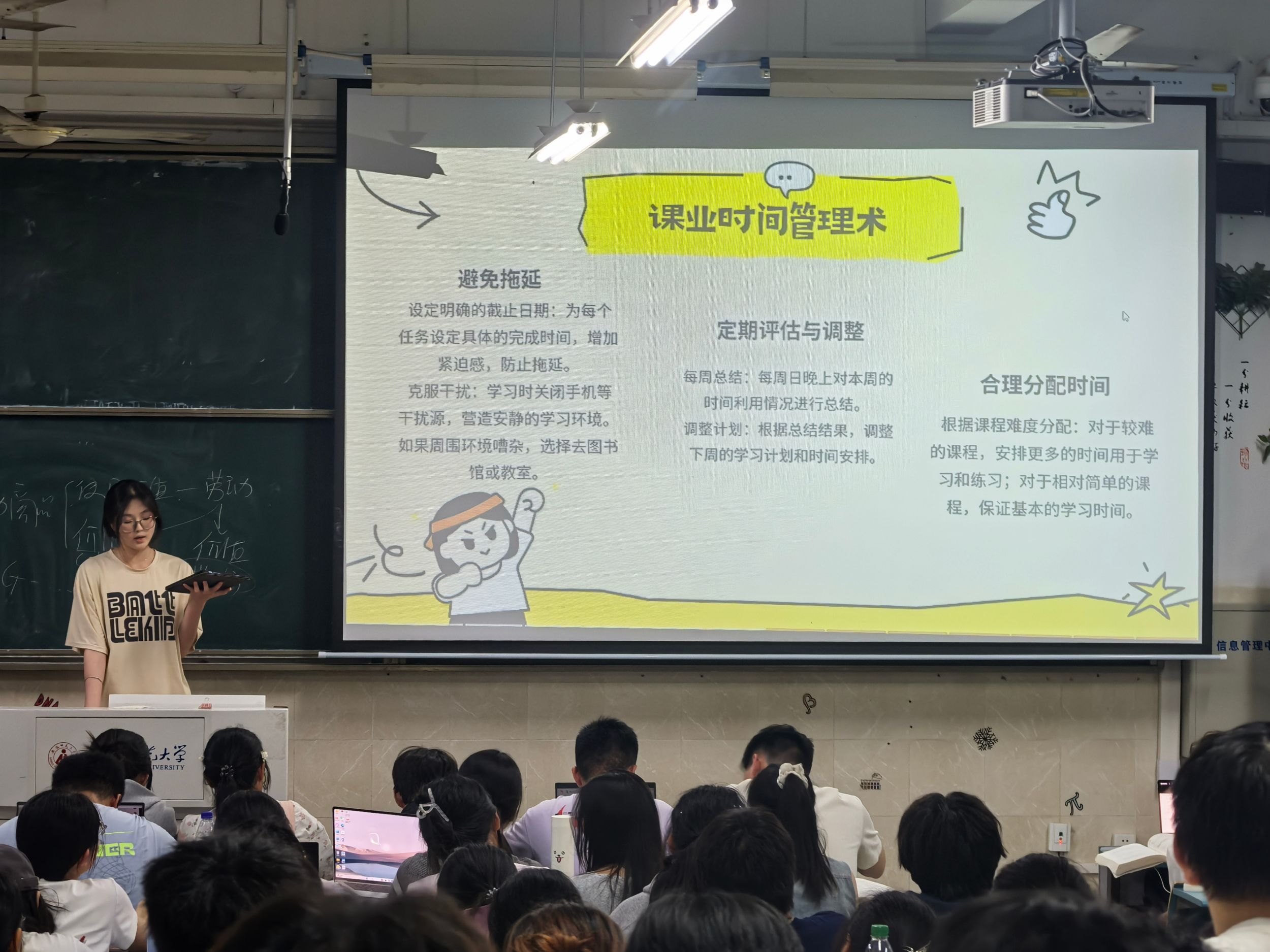分享环节结束后,杨洋老师结合同学们的发言,对此次班会进行总结。她要求同学们以优秀学生为榜样,树立明确的学习目标,端正学习态度,制定详细可行的学习计划,努力学习。同时,辅导员着重强调期末考试临近,同学们要充分利用课余时间,有条不紊地开展复习备考工作,查漏补缺,力争在期末考试中取得优异成绩。