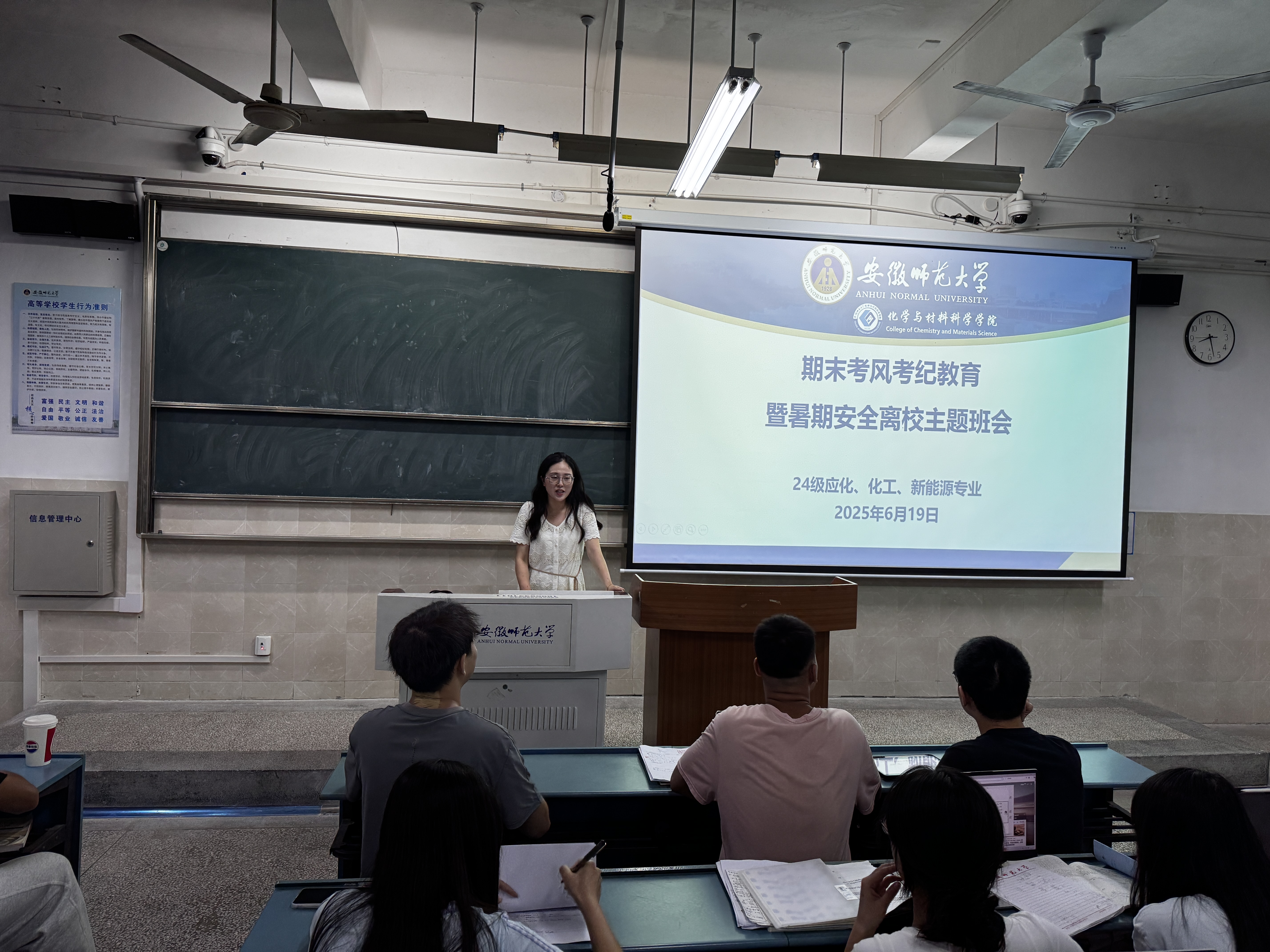 期末临近,为严肃考风考纪,强化学生诚信意识,同时确保暑期离校工作安全有序,6月19日晚上,24级化学工科专业在行知楼2010104、2010301、2010308分别召开班会,会议由辅导员王芳老师主持,24级应用化学、化学工程与工艺及新能源材料与器专业全体同学参会。