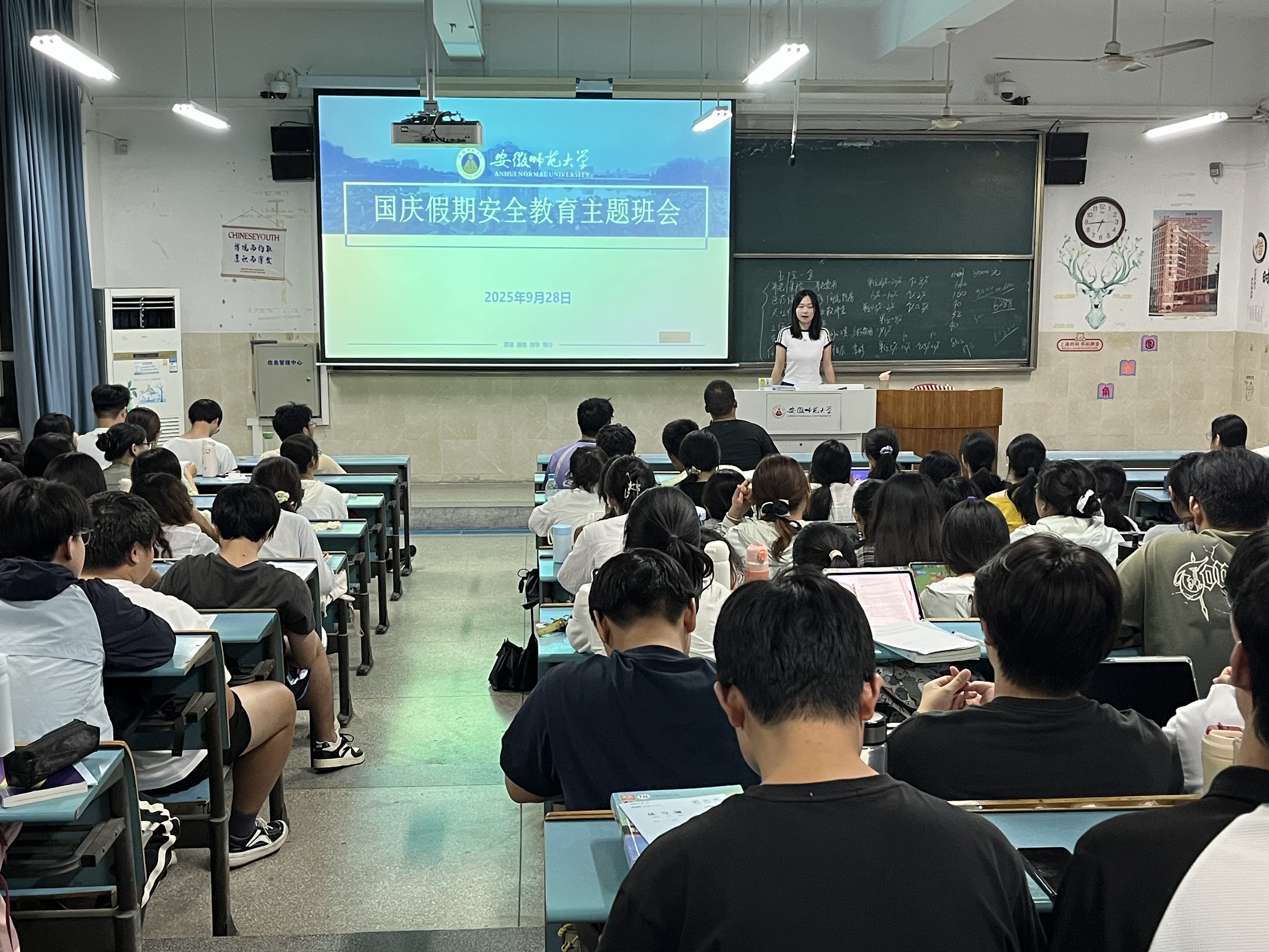 丁丽)为切实增强学生安全防范意识,保障全体学生度过一个平安、健康、快乐的国庆假期,9月28日,2023级化学师范专业各班级于行知楼各教室分班级开展了国庆安全主题教育会议,此次会议由辅导员王霞主持,全体同学参加。